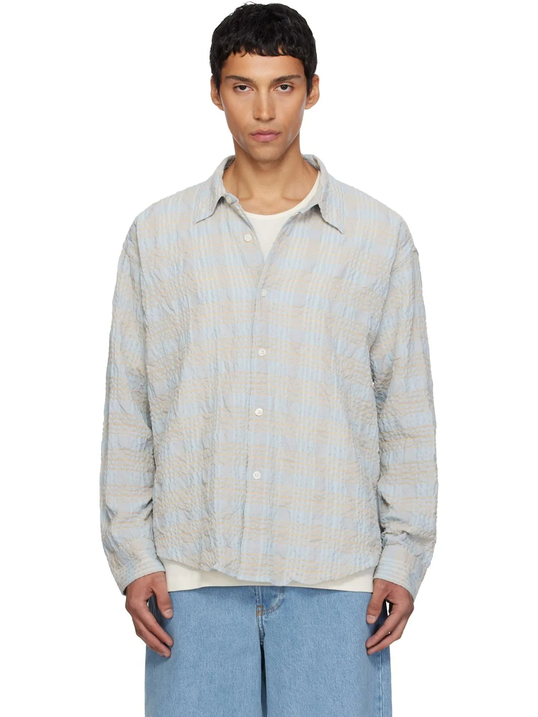 Oversized deadstock recycled cotton-blend seersucker shirt. · Garment-washed · Check pattern throughout · Spread collar · Button closure · Shirttail hem · Dropped shoulders · Adjustable buttoned barrel cuffs Supplier color: Pale blue structured 39% recycled cotton, 25% cotton, 32% polyester, 4% other fibers. Made in Portugal 252505M192011