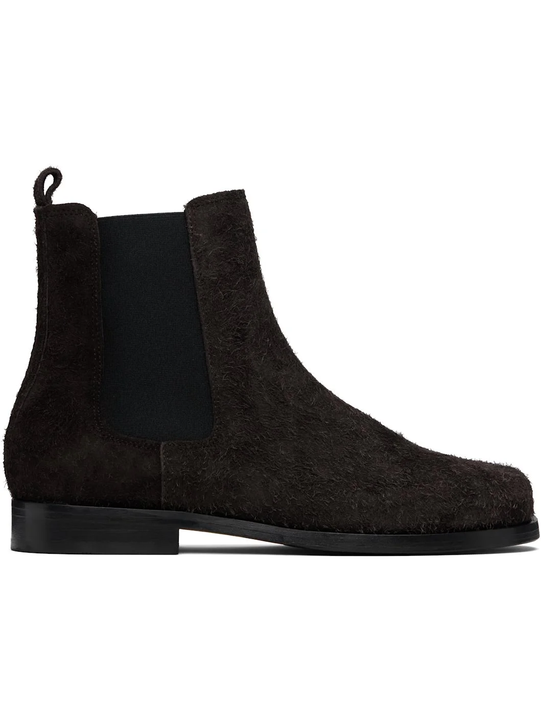 Ankle-high brushed suede boots. · Elasticized gusset at sides · Pull-loop at heel collar · Aniline-dyed leather lining · Hand-stacked leather heel and midsole · Leather sole with rubber injections Supplier color: Brown fuzzy suede Upper: leather. Sole: leather, rubber. Made in Portugal 252505M223001
