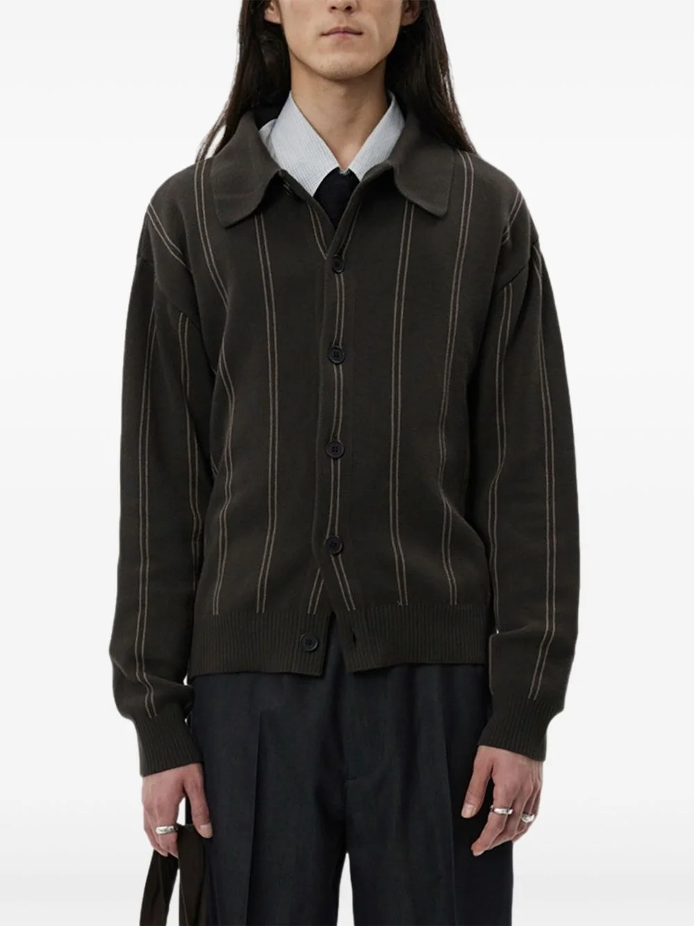 pinstripe collared cardigan Highlights - Brown - Pinstripe pattern - Collared neckline - Button fastening - Ribbed hem - Long sleeves Imported Composition Cotton 100% Washing instructions Read Manufacturer Guidelines