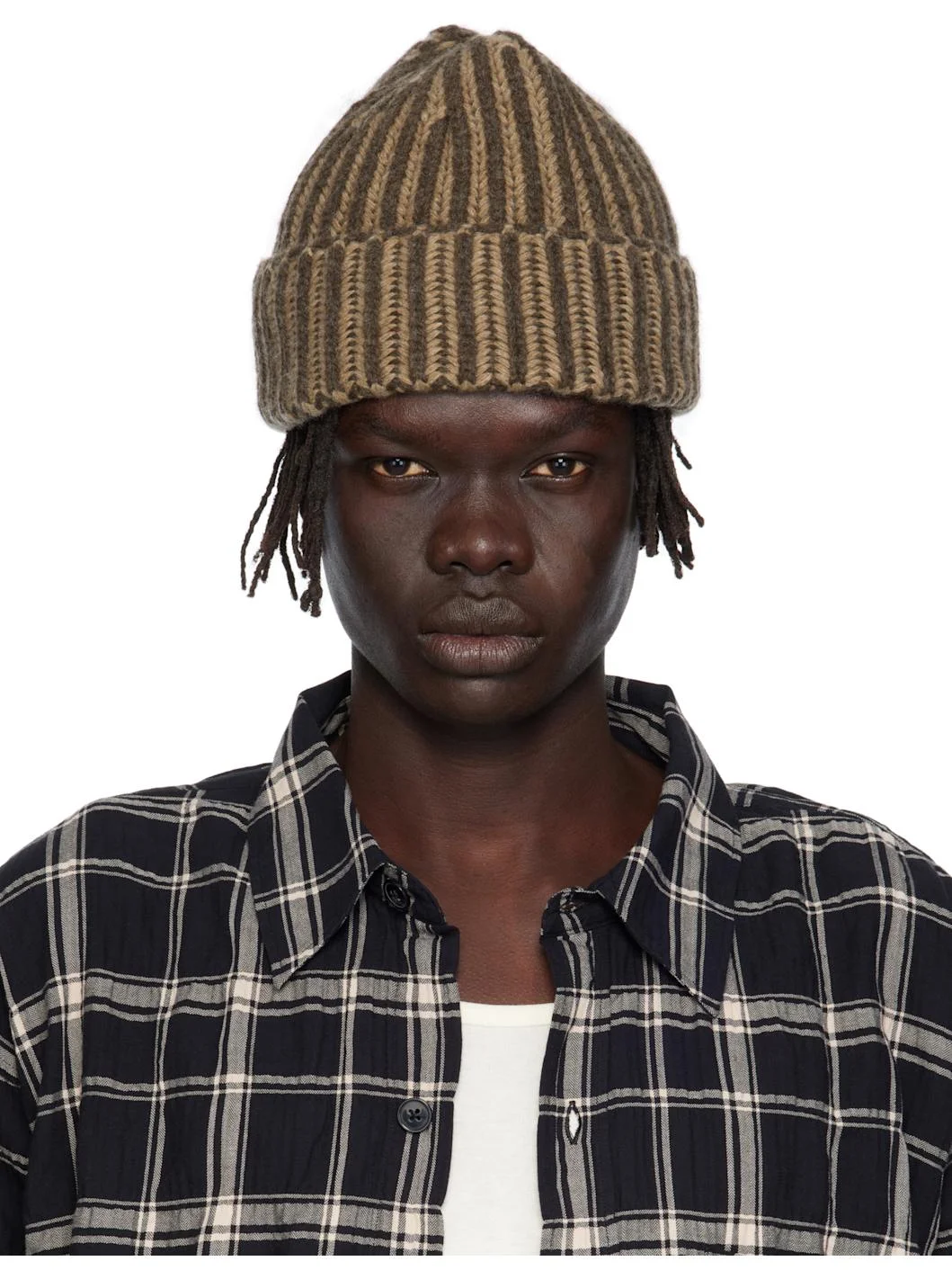 Knit wool beanie. · Knit stripes throughout · Rolled brim Supplier color: Biscuit 100% wool. Made in Portugal 252505M138002