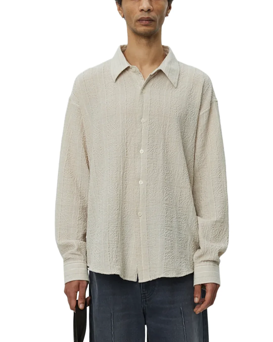 Made from a soft seersucker fabric cut in an extra-easy silhouette, mfpen's Check Seersucker Exact Shirt features dropped shoulders, aspread collar, and a back yoke. - Relaxed/loose fit - 100% organic cotton - Made in Portugal - Wash in cold water