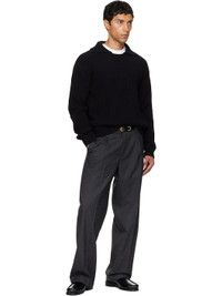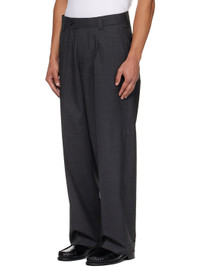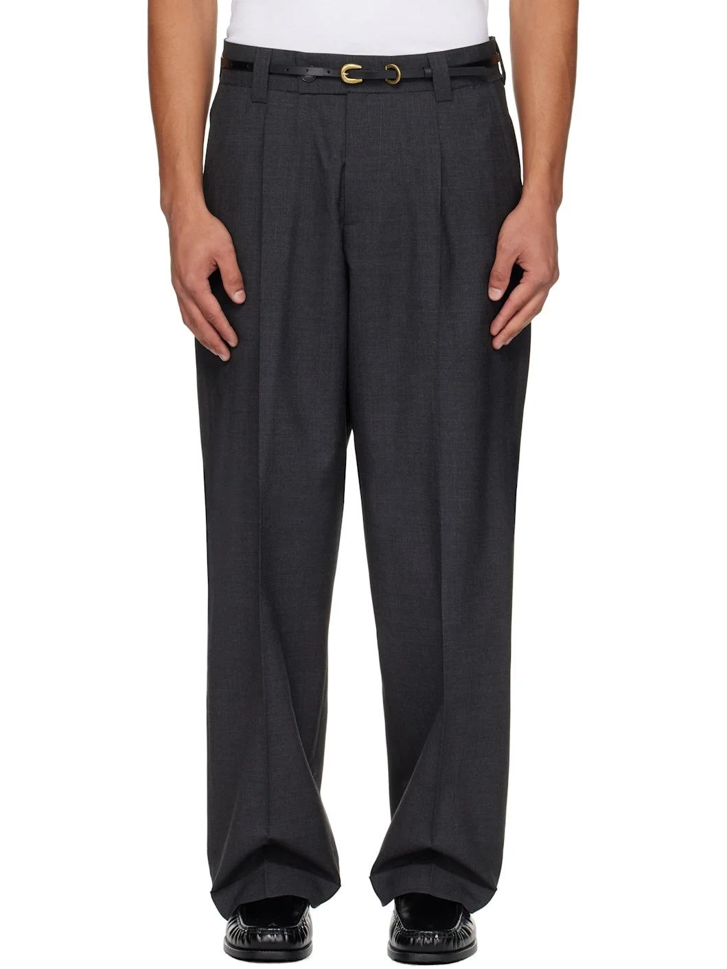 Deadstock wool delaine trousers. · Raw edges throughout · Wide straight-leg · Mid-rise · Belt loops · Four-pocket styling · Zip fly · Pleats at front · Creased legs · Partial satin lining Supplier color: Grey worsted wool Body: 100% wool. Trim: 70% polyester, 30% cotton. Lining: 100% polyester. Made in Portugal 252505M191000
