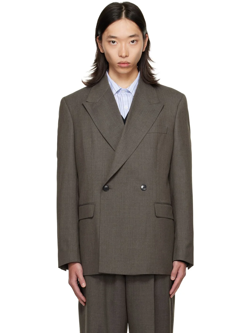 Wool twill blazer. · Peaked lapel · Double-breasted button closure · Welt pocket at chest · Flap pockets at front · Padded shoulders · Surgeon's cuffs · Central vent at back hem · Welt pocket at interior · Full satin lining Supplier color: Taupe wool Body: 100% wool. Lining: 100% polyester. Made in Portugal 252505M195000