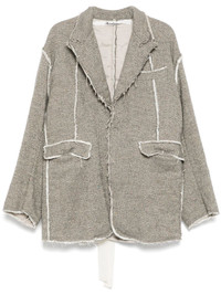 raw edge blazer Highlights - Grey - Drawstring waist - Front press-stud fastening - When buying this unisex item, keep in mind that it is graded in standard men's sizing. Imported Composition Wool 100% SIZE & FIT Model measurements Height 6 ft 2 in(1.87 m) Bust/Chest 33.07 in(84 cm) Hips 35.43 in(90 cm) Waist 26.77 in(68 cm) FittingInformation This unisex piece is designed for an oversized fit whether you usually select women's or men's sizes The tie fastening gives an adaptable and personalised fit Made from a padded non-stretch fabric, giving it no natural elasticity Washing instructions Dry Clean Only