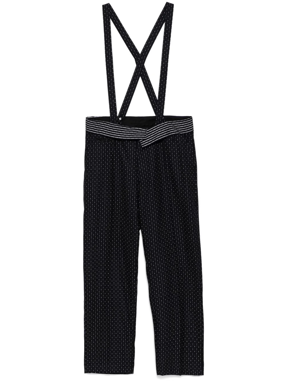 shoulder-strap tailored trousers Highlights - Navy blue - Concealed front fastening - Rear criss-cross straps - Polka dot print - When buying this unisex item, keep in mind that it is graded in standard men's sizing. Imported Composition Outer: Wool 78%, Polyester 22% Lining: Cupro 50%, Cotton 50% SIZE & FIT Model measurements Height 6 ft 2 in(1.87 m) Bust/Chest 33.07 in(84 cm) Hips 35.43 in(90 cm) Waist 26.77 in(68 cm) FittingInformation This piece is unisex and is designed with a straight-cut over the leg whether you usually select women's or men's sizes Made from a midweight non-stretch fabric Washing instructions Dry Clean Only