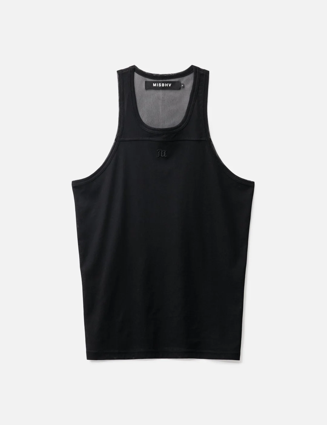- Misbhv - Double Layered Mesh Tank Top - Double layer mesh construction - U-neckline - Tonal Embroidered logo at center - Sheer finish - Straight hem - Color: Black - Material: 100% Polyamide - See more Tanks and Clothing SIZING - Model wears size M - Model measures: Height 186cm, Chest 35”/89cm, Waist 30.5”/78cm, Hip 35.5”/91cm