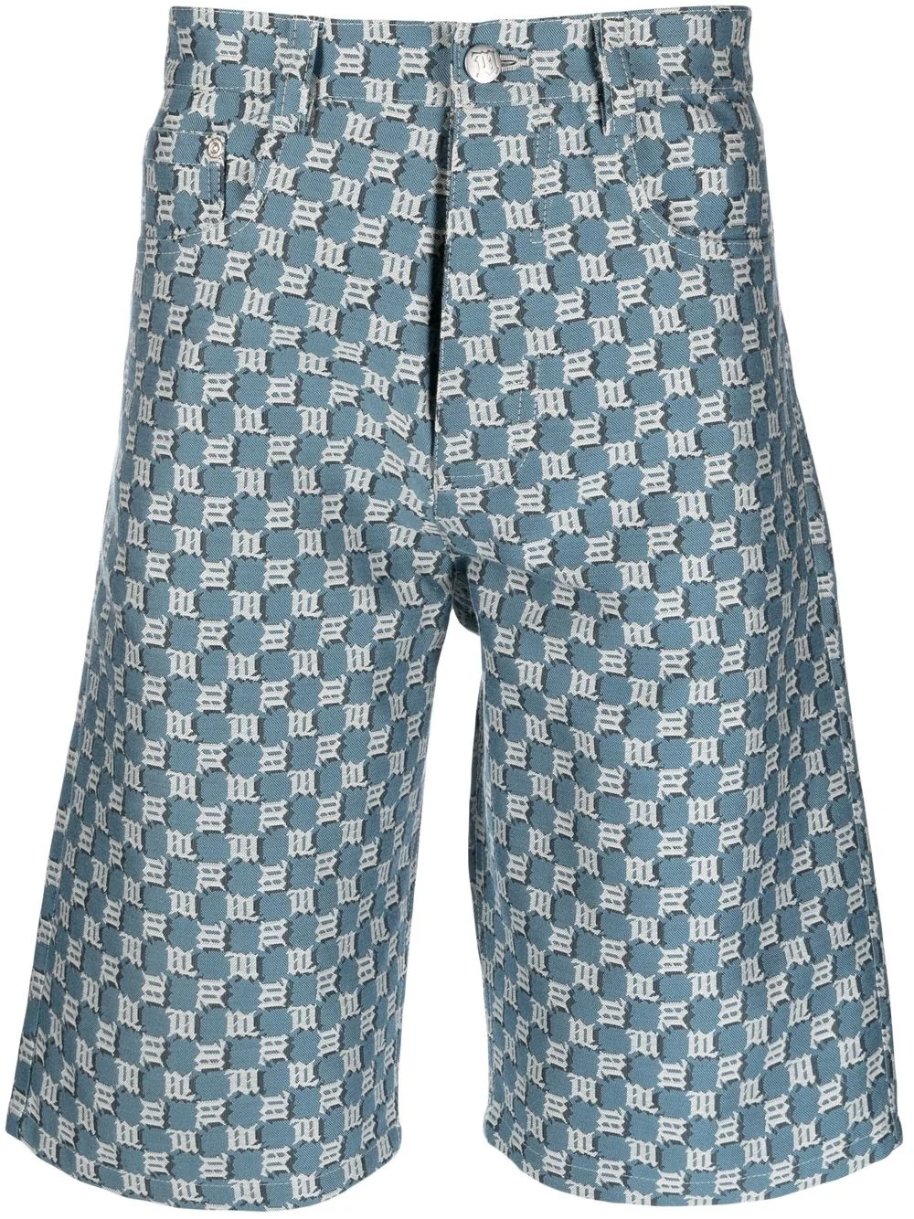 logo-print denim shorts light blue cotton blend all-over logo print front button and zip fastening classic five pockets knee-length Imported Composition Cotton 70%, Polyester 30% SIZE & FIT Model measurements Height 6 ft 2 in(1.88 m) Bust/Chest 35.03 in(89 cm) Hips 35.82 in(91 cm) Waist 27.95 in(71 cm) Washing instructions Machine Wash