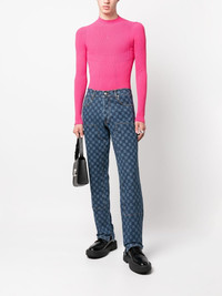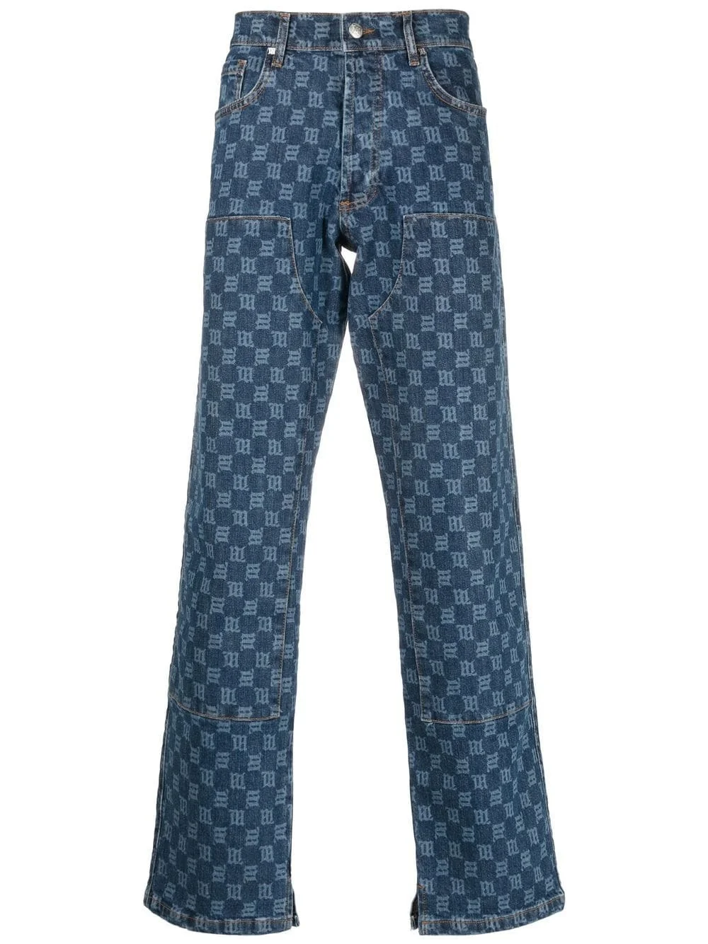 monogram-print carpenter jeans navy blue cotton blend monogram pattern front button fastening two diagonal pockets to the sides two rear patch pockets straight leg Imported Composition Cotton 80%, Recycled Cotton 14%, Polyester 4%, Spandex/Elastane 2% SIZE & FIT Model measurements Height 6 ft 2 in(1.87 m) Bust/Chest 35.82 in(91 cm) Hips 35.43 in(90 cm) Waist 27.95 in(71 cm) FittingInformation This piece fits true to size. We recommend you get your regular size Regular fit Made with a mid-weight stretch fabric Washing instructions Machine Wash