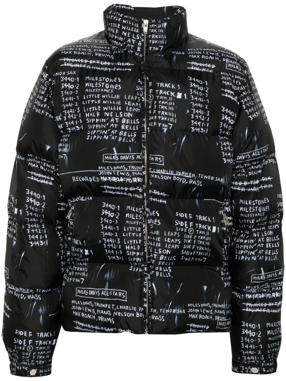 x Jean-Michel Basquiat Discography puffer jacket Highlights - Black - Padded design - All-over graphic print - Stand-up collar - Long sleeves - Press-stud fastening cuffs - Two side zip-fastening pockets - Logo-print lining - Internal zip-fastening pocket - Straight hem - Front zip fastening Imported Composition Lining: Polyester 100% Outer: Polyester 100% SIZE & FIT Model measurements Height 6 ft 2 in(1.88 m) Bust/Chest 36.61 in(93 cm) Hips 35.82 in(91 cm) Waist 27.95 in(71 cm) FittingInformation Designed for a relaxed fit, this piece allows for comfort and movement when worn The internal drawstring at the hem allows for fitted preferences Made from a padded non-stretch fabric, giving it no natural elasticity This piece fits true to size – take your usual size