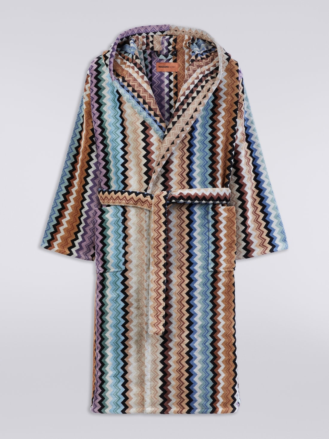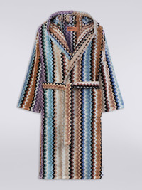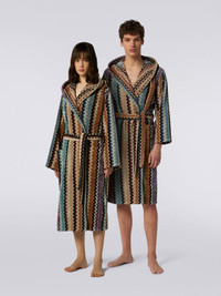 The comfort of the velour cotton terry characterises the Adam hooded bathrobe. This garment immediately shows the distinctive traits of MissoniHome's DNA, enriched by the multicoloured chevron pattern that always gives it its unmistakable touch. MORE DETAILS - Cotton terry bathrobe - Multicoloured chevron pattern - Waist belt - Patch pockets Composition: EXTERNAL:100%Cotton Care instructions: Wash max 40°C - Very mild process; Do not dry clean; Wash separately; Tumble drying at normal temperature max 80°C; Do not iron; Any bleaching agent allowed Made in: Portugal Product ID 1A3AC99701160