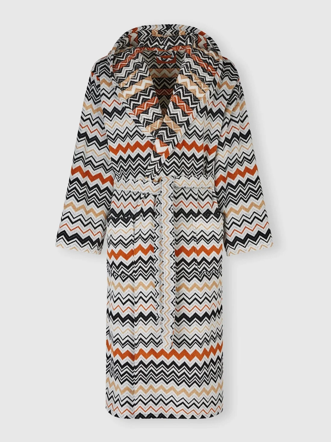 Furnishing the most intimate rooms of your home while indulging in the soft touch of cotton terry is made possible by Bernard, the MissoniHome bathrobe featuring an iconic chevron pattern. The wrap-around hood, waist belt and ample patch pockets complete the garment. MORE DETAILS - Cotton terry bathrobe - Zigzag pattern - Waist belt - Hood - Patch pockets Composition: EXTERNAL:100%Cotton Care instructions: Tumble drying at lower temperature; Wash max 40°C; Do not dry clean; Do not bleach; Ironing maximum temperature 150°C Made in: Portugal Product ID 1B3AC99708160