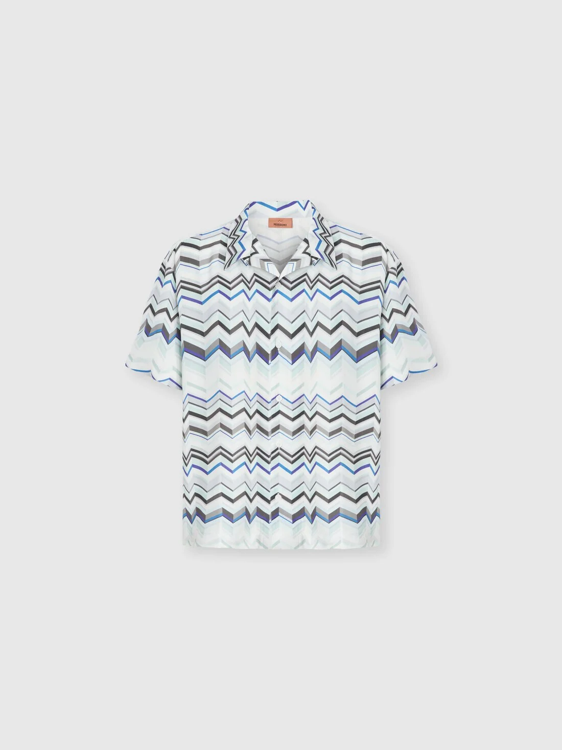 Missoni experiments with new forms and graphics, creating this men’s bowling shirt in 100% viscose, animated by an irregular zigzag print. A piece that combines the relaxed spirit of the style with the Maison’s bold and unmistakable aesthetic. MORE DETAILS - Men’s bowling shirt - Short sleeves - Irregular zigzag print - 100% viscose Composition: EXTERNAL:100%Rayon Care instructions: Wash max 30°C - Mild process ; Ironing maximum temperature 110°C - without steam ; Wash inside out ; Do not tumble dry ; Iron inside out ; Do not dry clean ; Do not bleach Made in: Tunisia Product ID BS26SJ01BW00ZVS01KE