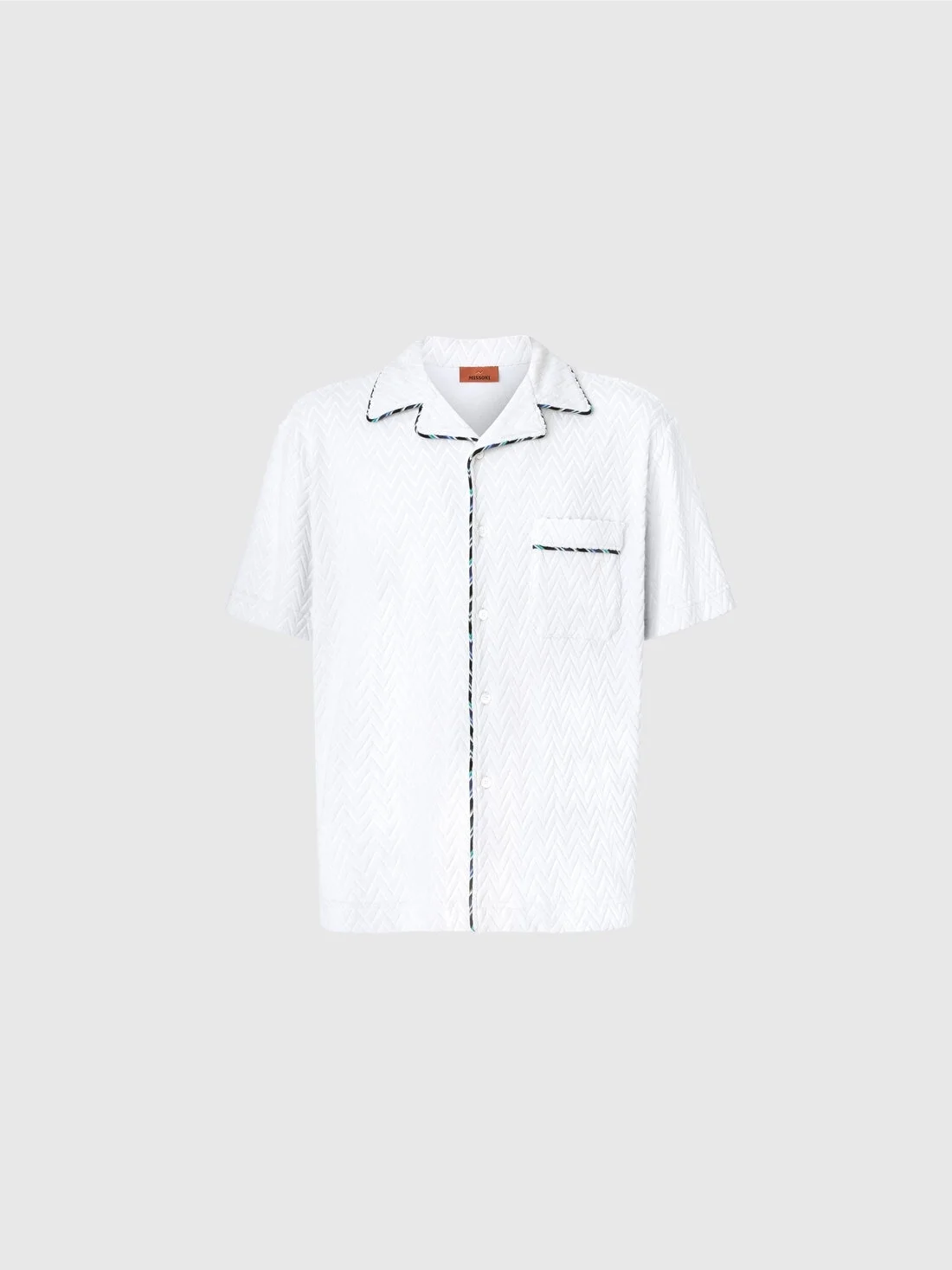 With its cotton jacquard terry weave and chevron pattern, this bowling shirt stands out for its summer freshness and attention to detail. Subtle contrasting piping, delicately placed along the placket and collar, create a graphic contrast that adds depth to the zig zag pattern, striking a perfect balance between casual style and high-quality craftsmanship. MORE DETAILS - Cotton Joggers - Embroidery with iconic zig zag motif Composition: EXTERNAL:84%Cotton, 16%Polyamide Care instructions: Wash max 30°C - Mild process ; Dry cleaning in tetrachloroethene - mild process ; Ironing maximum temperature 110°C - without steam ; Do not tumble dry ; Do not bleach Made in: Tunisia Product ID US25SJ07BJ00MES01G3
