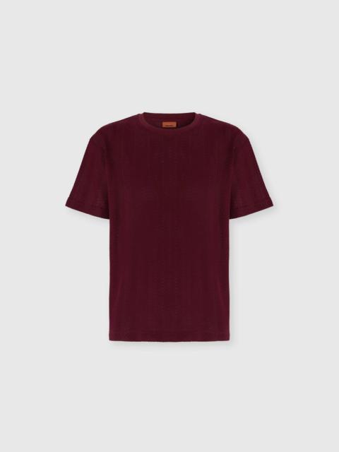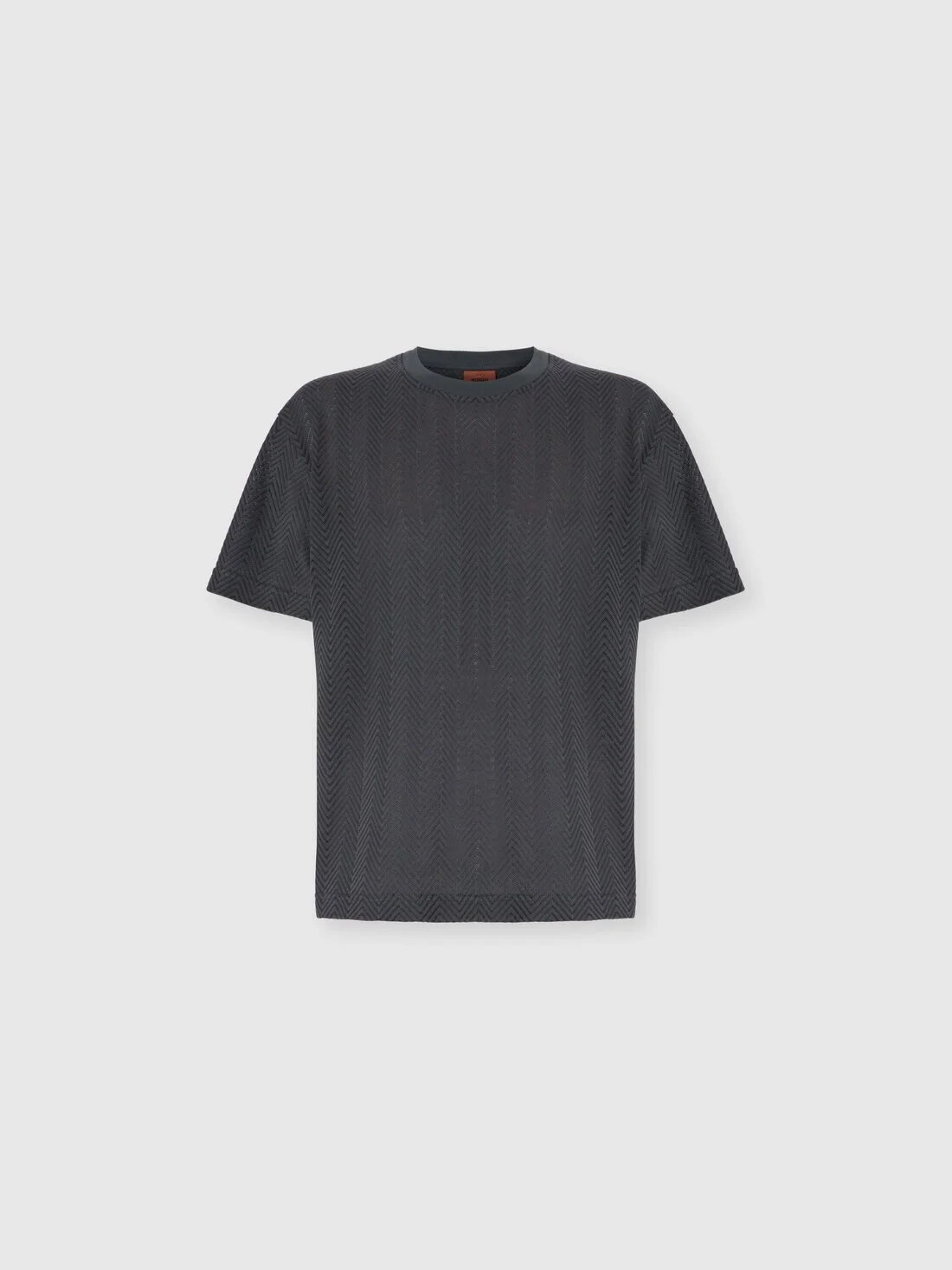 A refined cotton and viscose knit for this men's short-sleeve crew-neck T-shirt. The raschel workmanship with tone-on-tone zigzag defines the relaxed-fit model. MORE DETAILS - Crew-neck T-shirt short sleeve - Cotton and viscose knit - Tone-on-tone raschel pattern Composition: EXTERNAL:74%Cotton, 26%Rayon; INSERTS:100%Cotton Care instructions: Ironing maximum temperature 110°C - without steam ; Hand wash ; Dry cleaning in tetrachloroethene - mild process ; Do not tumble dry ; Dry flat ; COOL HAND WASH ; Do not bleach Made in: Italy Product ID US25WL02BR0122S91Q1