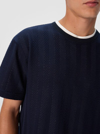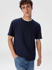 A refined cotton and viscose knit for this men's short-sleeve crew-neck T-shirt. The raschel workmanship with tone-on-tone zigzag defines the relaxed-fit model. MORE DETAILS - Crew-neck T-shirt short sleeve - Cotton and viscose knit - Tone-on-tone raschel pattern Composition: EXTERNAL:74%Cotton, 26%Rayon; INSERTS:100%Cotton Care instructions: Ironing maximum temperature 110°C - without steam ; Hand wash ; Dry cleaning in tetrachloroethene - mild process ; Do not tumble dry ; Dry flat ; Cool Hand Wash ; Do not bleach Made in: Italy Product ID US25WL02BR012293810