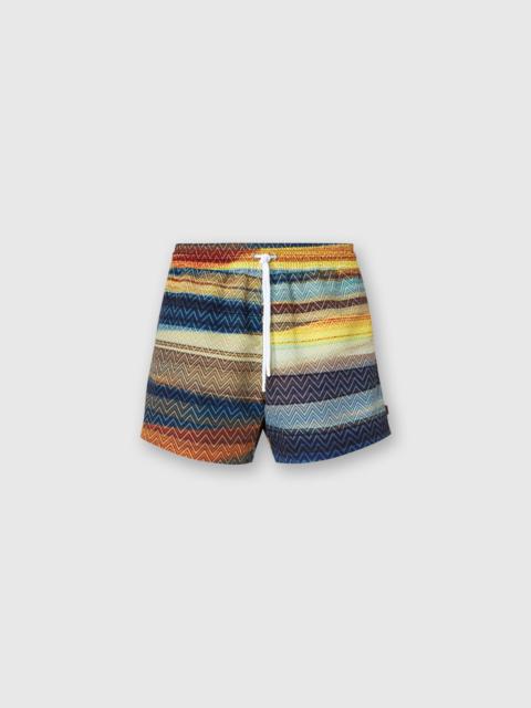Sophistication finds its expression in the details in these tone-on-tone zigzag swim trunks. The balance between the simplicity of the design and the complexity of the zigzag pattern creates a discreet but impactful garment, ideal for those looking for a refined style even at the beach. MORE DETAILS - Swim shorts - Iconic zigzag pattern macro version Composition: EXTERNAL:100%Polyester; LINING : 100%Polyester Care instructions: Wash max 30°C - Mild process ; Do not tumble dry ; Do not dry clean ; Do not iron ; Do not bleach Made in: Tunisia Product ID US25SP00BW00VTS6147