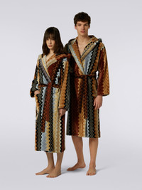 A vibrant take on the iconic chevron pattern, the Giacomo bathrobe is made from soft cotton terry. Designed for him or her, it features an enveloping hood, a waist belt and patch pockets. Composition: EXTERNAL:100%Cotton Care instructions: Ironing maximum temperature 150°C; Do not dry clean; Wash max 40°C; Do not bleach Made in: Portugal Product ID 1G3AC99708160