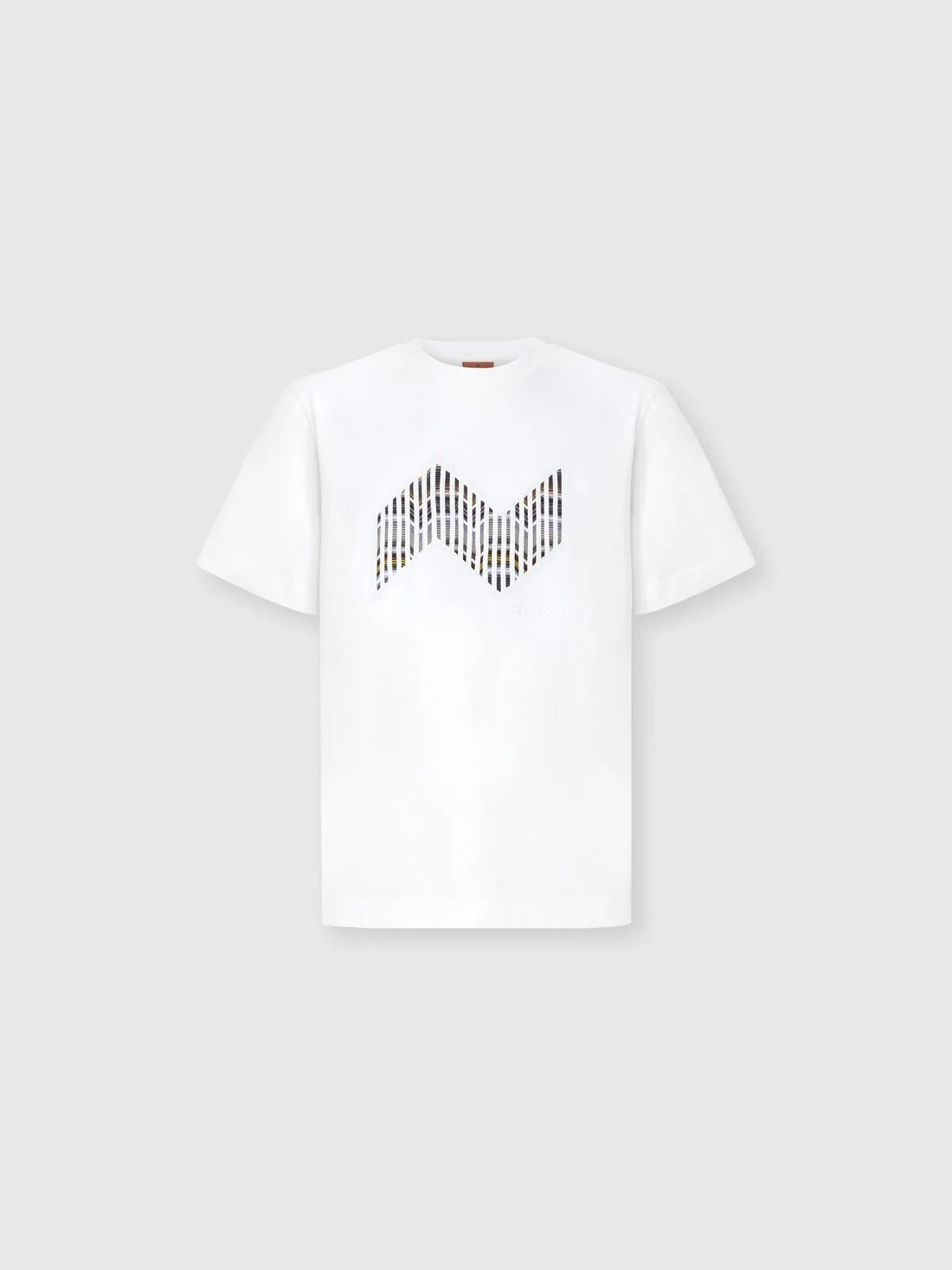 Clean lines and bold graphics define this men’s short-sleeve T-shirt in cotton jersey, offered in a regular fit. The raschel insert highlights an elegant geometric zigzag, reinterpreting one of Missoni’s most iconic patterns with a textural edge. The tone-on-tone embroidered logo adds a subtle yet distinctive touch, signing the garment with elegance. MORE DETAILS - T-shirt short sleeve - Regular fit - 100% cotton - Cotton jersey - Geometric zigzag raschel insert - Logo embroidery Composition: EXTERNAL:100%Cotton; TRIMMING:100%Cotton Care instructions: Wash max 30°C - Mild process ; Ironing maximum temperature 110°C - without steam ; Do not tumble dry ; Do not dry clean ; Do not bleach Made in: Tunisia Product ID US25WL07BJ00OYS01I6