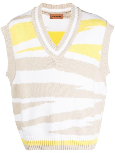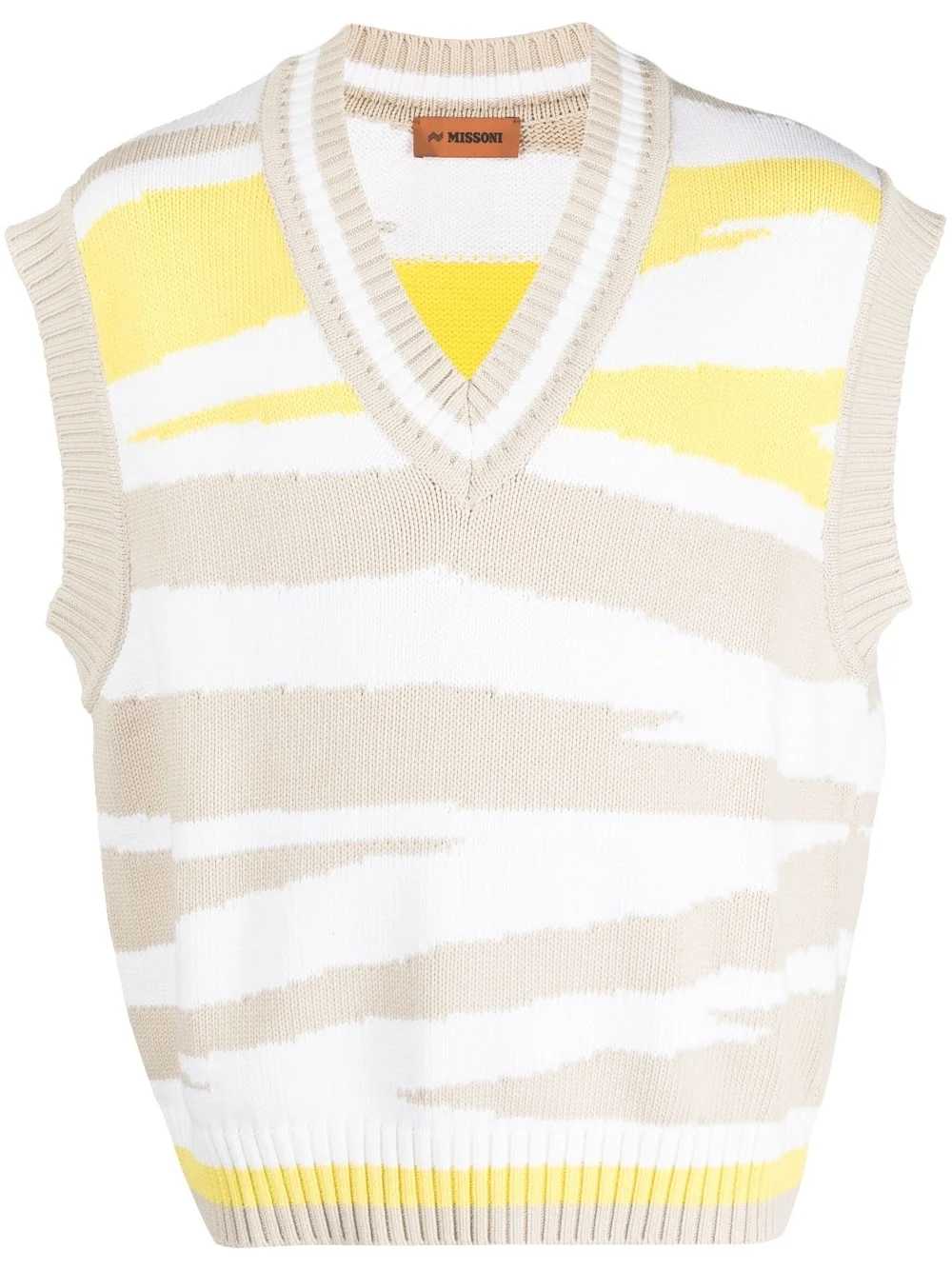 knitted zebra-print vest light beige/light yellow cotton blend knitted construction intarsia knit V-neck ribbed cuffs and hem straight hem The item you receive may differ slightly from the item photographed. This is due to the artisanal nature with which all Missoni products are constructed. Made in Italy Composition Cotton 68%, Polyamide 32% SIZE & FIT Model measurements Height 6 ft 2 in(1.89 m) Bust/Chest 37.4 in(95 cm) Hips 35.03 in(89 cm) Waist 27.95 in(71 cm) FittingInformation Designed to be unstructured, offering a loose fit throughout Made with a midweight knit, this piece offers some stretch This piece fits true to size – take your usual size Washing instructions Dry Clean Only