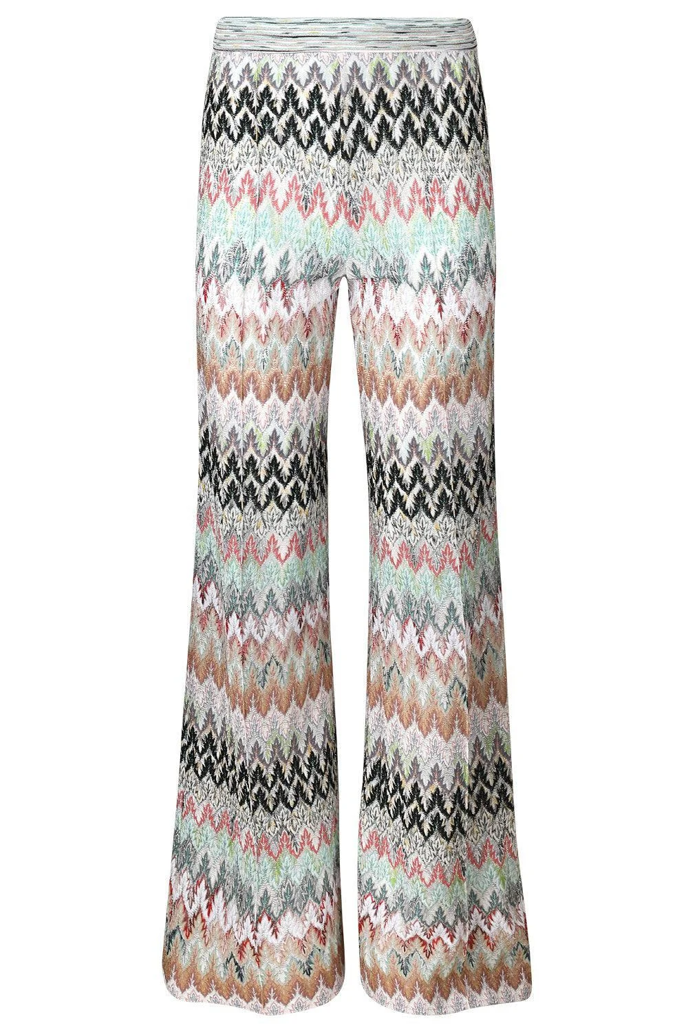 DETAILS AND INSIGHT Missoni wide leg knit trousers in white, pink and light blue tones. External :39%Co + 9%Fm + 52%Vi; Internal Reinforcement :100%Pa; Hand Wash Made In Italy Style DS26SI09-SM9Y4
