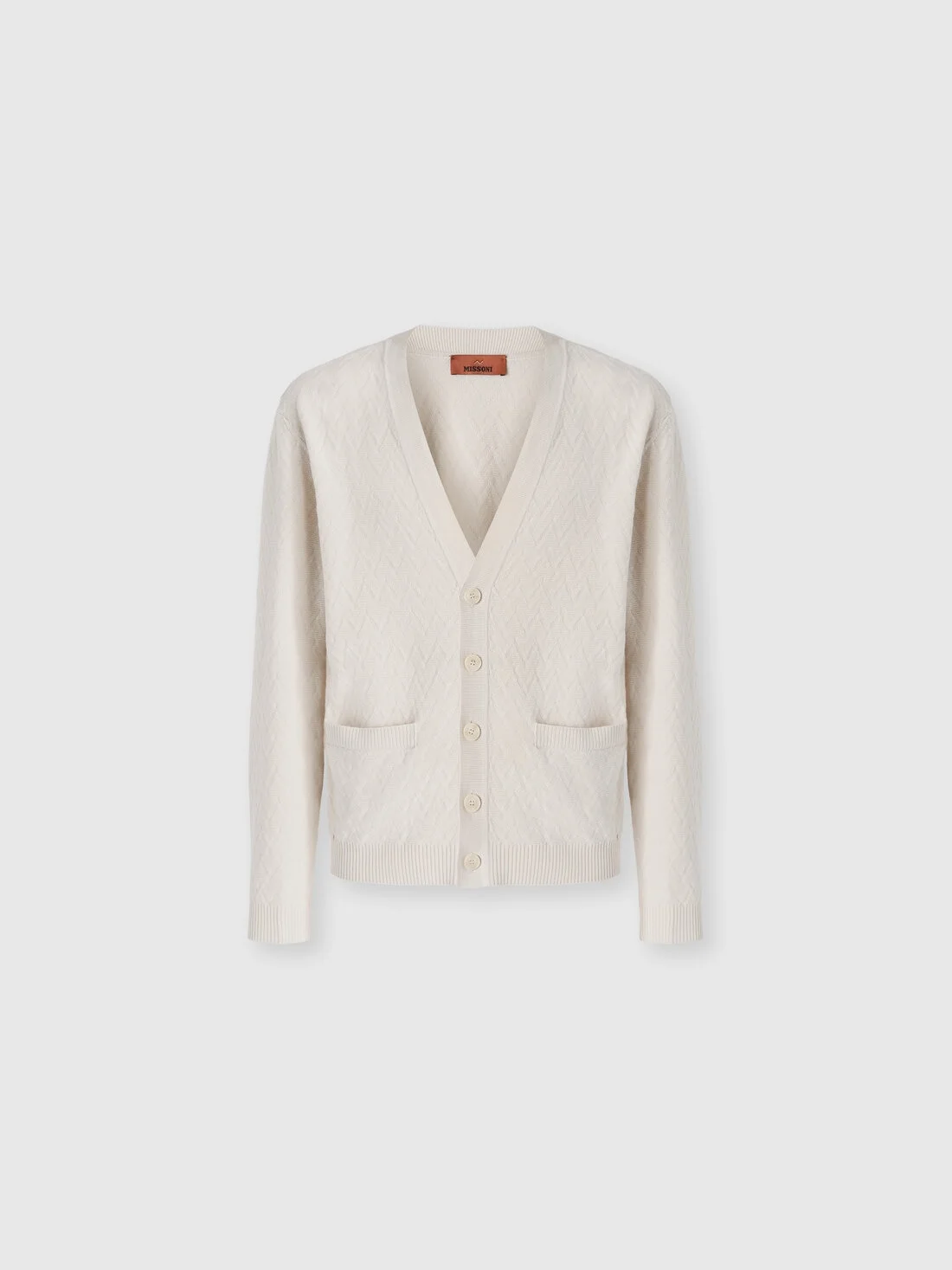 Made from a soft blend of wool and cotton, this men’s cardigan is characterized by a chevron pattern that highlights its identity. The front pockets complete the design, expressing the refined elegance of the maison. MORE DETAILS - Men’s cardigan with pockets - Tone-on-tone chevron pattern - Wool and cotton blend Composition: EXTERNAL:60%Cotton, 40%Wool Care instructions: Hand wash ; Dry cleaning in tetrachloroethene - mild process ; Ironing maximum temperature 110°C - without steam ; do not expose to heat ; Do not tumble dry ; Dry flat ; Iron with a cloth between ; Do not bleach Made in: Croatia Product ID US26SM08BK01HHS01KJ