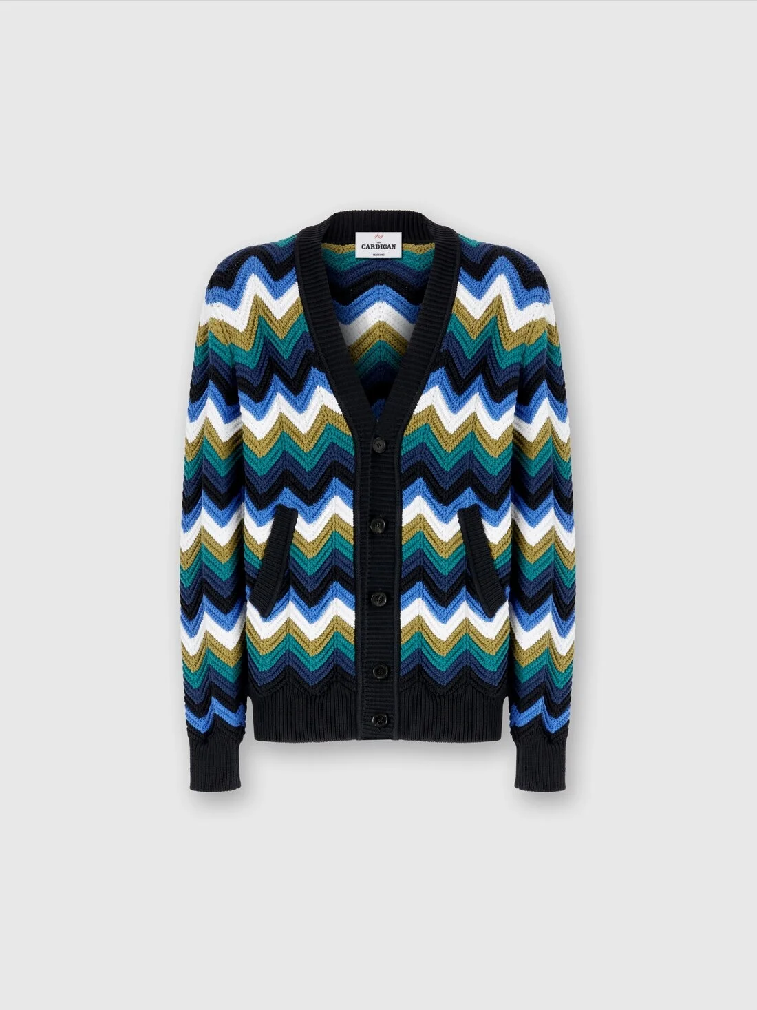 Chevron knit cardigan with pockets and contrasting piping