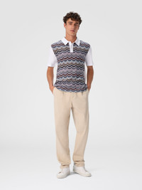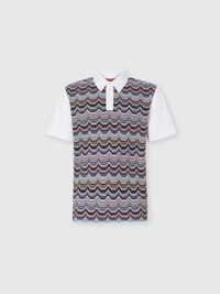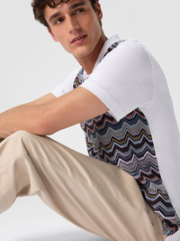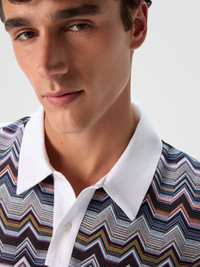 A graphic and refined mix defines this short-sleeve men’s polo, regular fit, made of cotton jersey. The body is animated by Missoni’s iconic geometric zigzag motif, worked in raschel, while the solid color sleeves create a clean and modern contrast, for a distinctive yet balanced look. MORE DETAILS - Short-sleeve polo regular fit - Geometric zigzag pattern - Raschel knit - Cotton jersey Composition: EXTERNAL:100%Cotton; INSERTS:100%Cotton Care instructions: Wash max 30°C - Mild process ; Ironing maximum temperature 110°C - without steam ; Do not tumble dry ; Do not dry clean ; Do not bleach Made in: Tunisia Product ID US25W20HBJ00OYS01I6