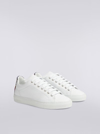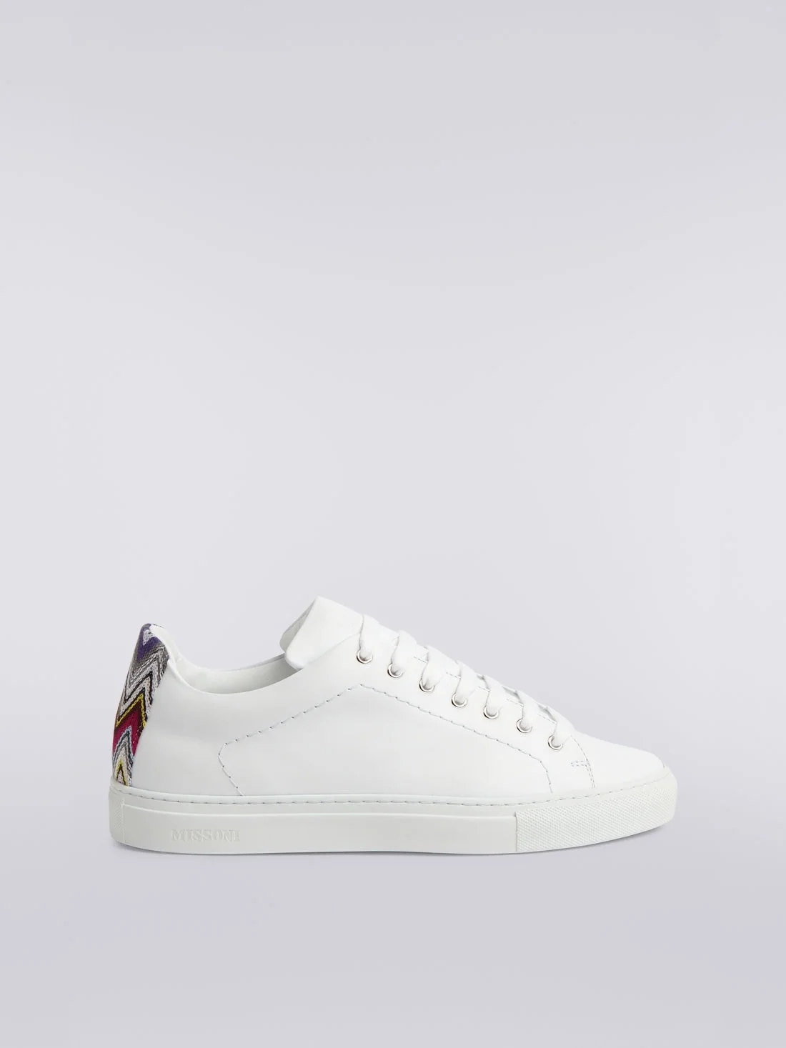 Rounded toe, rubber sole, practical lace-up upper: these leather trainers have everything they need to be an essential leisure accessory. The bonus, however, is the brand’s touch, adding a ‘very Missoni’ detail on the heel, with a multicoloured chevron knit insert. MORE DETAILS - Leather trainers - Laced upper - Multicoloured chevron knit insert - Rubber sole with embossed logo Composition: UPPER:95%Calf leather, 5%Cotton; LINING : 100%Pelle Capra; SOLE:100%Rubber Made in: Italy Product ID OS23SY02BL007USM8MU
