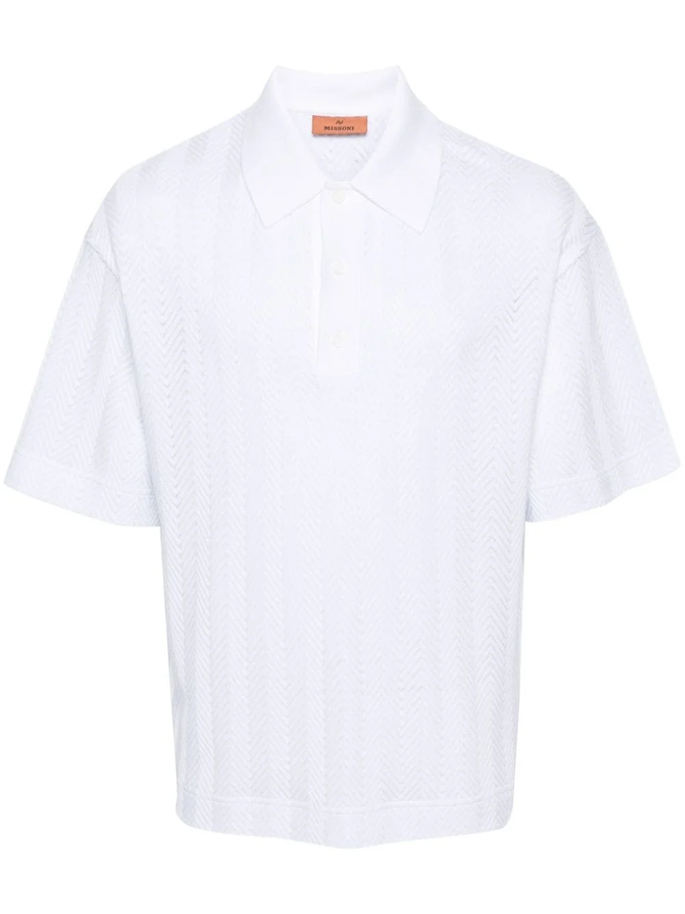 zigzag-woven polo shirt Highlights - White - Cotton blend - All-over signature zigzag woven design - Rubberised logo detail to the rear - Polo collar - Short sleeves - Straight hem - Front button placket - The item you receive may differ slightly from the item photographed. this is due to the artisanal nature with which all missoni products are constructed. Made in Italy Composition Cotton 74%, Viscose 26% SIZE & FIT Model measurements Height 6 ft 1 in(1.86 m) Bust/Chest 36.61 in(93 cm) Hips 37 in(94 cm) Waist 28.74 in(73 cm) FittingInformation Designed for a regular fit, this polo shirt offers a comfortable loose fit throughout the body Made with a midweight knit, this piece offers some stretch This piece fits true to size – take your usual size Washing instructions Dry Clean Only