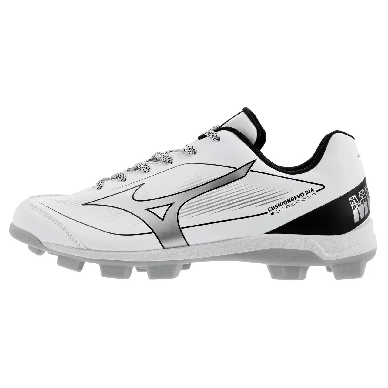 The Mizuno Cushionrevo DIAMOND TPU is built for speed and durability, featuring an all-weather synthetic upper that stands up to the elements. The reinforced toe offers extra structural support, while the lightweight design keeps you quick on your feet. With a low-top cut for enhanced ankle mobility, this cleat is perfect for players who need flexibility and comfort without sacrificing performance. Ideal for dynamic play, the Cushionrevo DIAMOND TPU delivers the support and agility you need on the field. - TPU Outsole: Great traction designed for versatility and multi-sport use. - GROUND GRIP: Multi stud outsole for superior grip and traction for all types of fields. - Printed RUNBIRD® Logo - Technical Synthetic Upper: Soft and durable synthetic leather that meets the demands of the modern game. - MIZUNO ENERZY (FOAM): Provides amazing cushioning and energy return.
