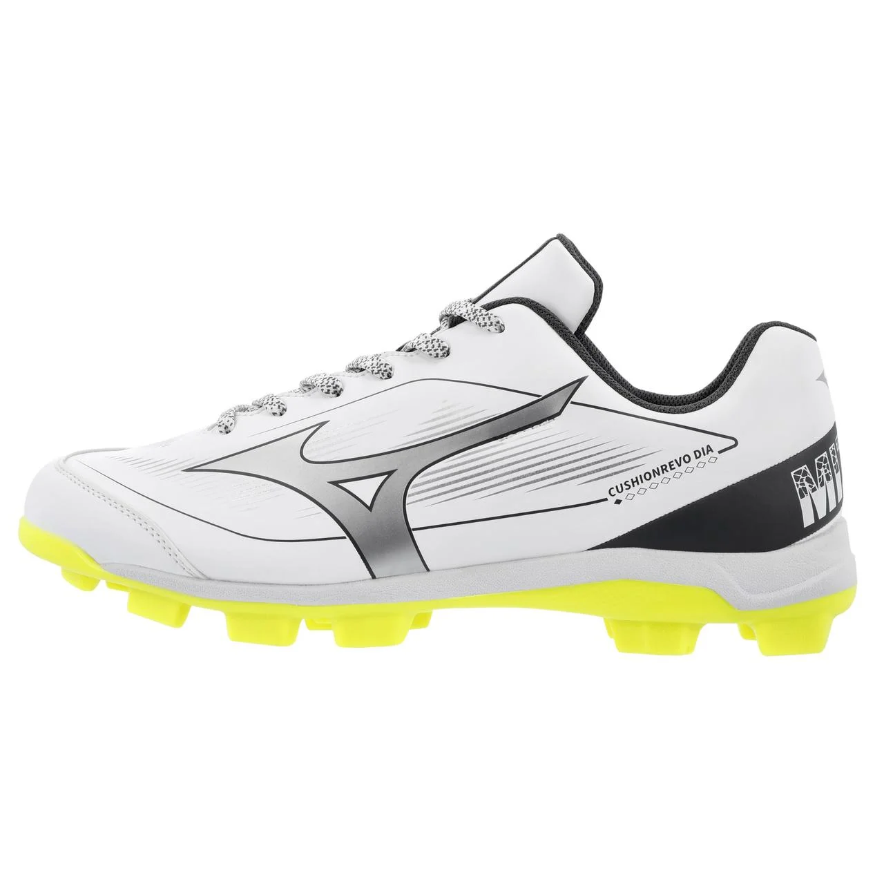 The Mizuno Cushionrevo DIAMOND TPU is built for speed and durability, featuring an all-weather synthetic upper that stands up to the elements. The reinforced toe offers extra structural support, while the lightweight design keeps you quick on your feet. With a low-top cut for enhanced ankle mobility, this cleat is perfect for players who need flexibility and comfort without sacrificing performance. Ideal for dynamic play, the Cushionrevo DIAMOND TPU delivers the support and agility you need on the field. - TPU Outsole: Great traction designed for versatility and multi-sport use. - GROUND GRIP: Multi stud outsole for superior grip and traction for all types of fields. - Printed RUNBIRD® Logo - Technical Synthetic Upper: Soft and durable synthetic leather that meets the demands of the modern game. - MIZUNO ENERZY (FOAM): Provides amazing cushioning and energy return.