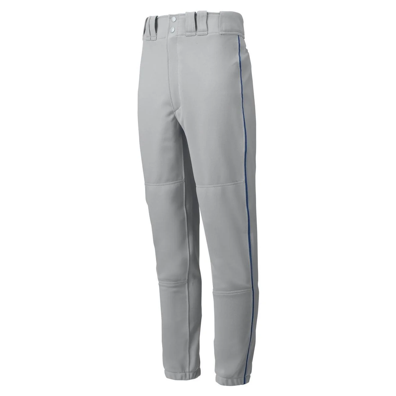 Performance at the highest level the Mizuno Premier Piped Baseball Pant offers the player a professional look and feel. This elastic finished leg opening style is offered in various piping colorways and is known as one of the most durable baseball pants on the market! - Tunnel-belt loop waist - Fly front with extended two-snap closure - Set-in back pockets with button closure - Double Knee: Dual-layer knee construction for added protection. - Elastic bottom - Embroidered Logo - Double Knit: Lightweight and durable fabric construction - DRYLITE?: Using a dual filament yarn construction to transport excess moisture away from the body to create a comfortable and dry body microclimate for best performance.