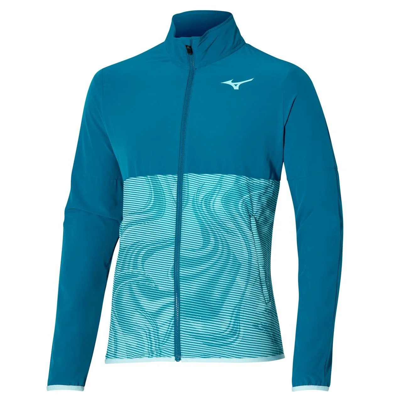 The Men's Printed Jacket is a water repellent and wind resistant, full-zip jacket designed for performance on and off the court. Lightweight, stretch woven fabric allows for optimal freedom of movement and comfort while IMPERMALITE technology protects against the elements. It includes two zippered side pockets for storage. NOTE: Right-insert zipper at front. - IMPERMALITE® : Superior water protection. A lightweight, breathable, microweave shell provides unsurpassed performance and comfort. - Full Zip Jacket - Water repellent - Wind resistant - Lightweight stretch woven fabric - Two Zipper Pockets - MIZUNO RUNBIRD® logo on front