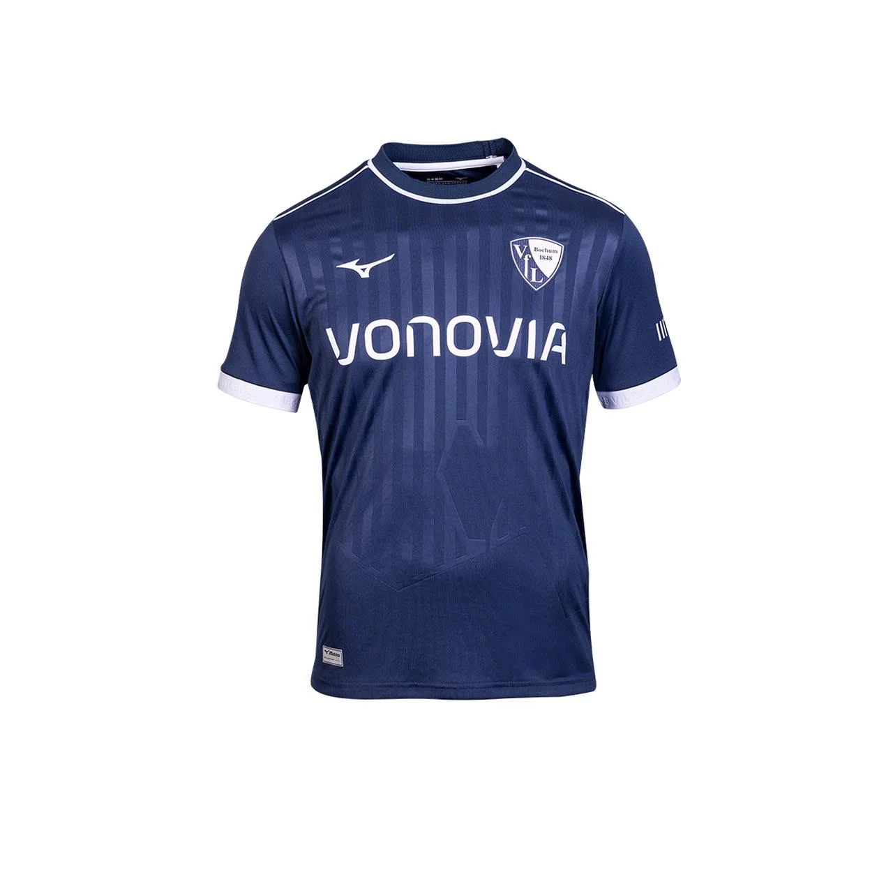 The home jersey is a diagonal pinstriped graphic on the front of the jersey. The shirt incorporates the run bird logo on the right chest and VFL Bochum’s club crest on the left.