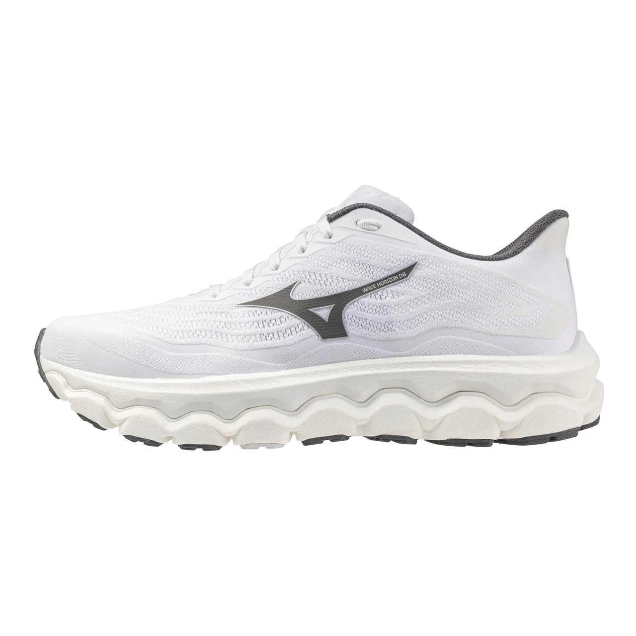 Elevate to new heights with the Wave Horizon 8, delivering an unparalleled floating experience fused with superior stability. Unveiling the latest MIZUNO ENERZY NXT cushioning, immerse yourself in a softer, bouncier sensation while experiencing enhanced support from the rubber wall on the midsole's medial side. Lighter than its predecessor, this shoe seamlessly blends a floating feel with heightened stability, ensuring each stride feels weightless yet grounded, perfect for runners seeking ultimate comfort and support. - MIZUNO ENERZY (FOAM): Offering versatility in its application, while still maintaining softness and resilience. It will help enhance performance capabilities. - Foam Wave: A Wave of comfort made of 2 layers of foam. Top layer is U4icX and bottom layer Mizuno Enerzy - Foam Wave: A Wave of comfort made of 2 layers of foam. Top layer is U4icX and bottom layer Mizuno Enerzy - Smooth Stretch Woven: Designed to control stretching direction for running motion and performance. Smooth Stretch Woven adapts to your foot and keeps your foot position correct. - Gusseted Tongue: Stretchy tongue lining that hugs the foot securely and comfortably without any stress. - X10 Outsole: Durable carbon rubber that allows for longer wear. - Eco Friendly Materials: Recycled materials - MIZUNO ENERZY NXT: The next generation of MIZUNO ENERZY midsole material. Designed to maximize energy return and cushioning for optimum performance. - Category: Support - Drop: 8mm - Stack Height: Forefoot 33mm / Heel 41mm - Weight: 11.3 oz (Size 9)