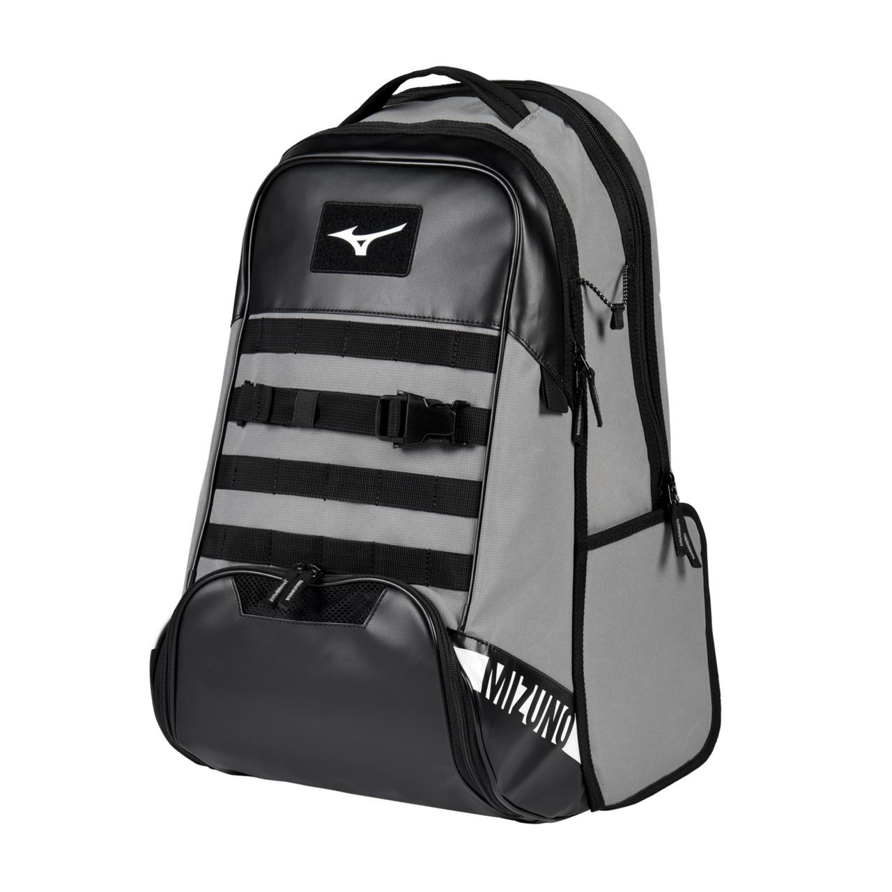 The NEW MVP Backpack 22 is designed with many intuitive features to give players options to store their gear, including MOD loops and Molle strap system, which provide customizable storage options. The velcro patch allow for further customization by allowing players the option to add their own patch. A laptop sleeve, bat and bottle storage, ventilated footwear compartment, and multiple storage pocket decks this bag out with plenty of premium features. - 4 Bat Sleeves: Store up to 4 bats or use as a water bottle pouch. - Felted Cell Phone Sleeve: Helps protect cellphone, while also positioned in front for ease of convenience. - Ventilated Footwear Storage Compartment: Separates shoes from rest of bag to protect and aerate your footwear. - Helmet J Hook: Easily attach helmet to hook for convenient in-game storage. - J Hook Fence Hanger with Hideaway Pocket: Easily hang bag or safely tuck-in when not in use. - Mizuno Aerostraps: For maximum comfort carrying all of your gear. - Screened Mizuno RunBird Logo - Small Mesh Front Pocket: For in-game storage. - Ventilated Side Pouch: To store your batting gloves or a water bottle. - Padded Back: For optimum comfort. - Molle Attachment Straps - Dimensions: 10"x13"x21" Volume: 51 Liters