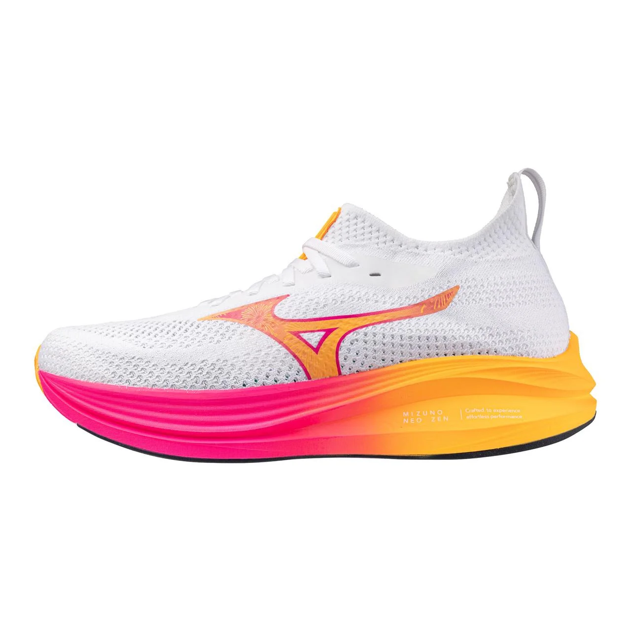 Discover serenity in motion with the Mizuno Neo Zen, merging the essence of Zen with advanced technology. Smooth Speed Assist technology allows for a smooth midfoot run, perfect for long jogs, while reveling in the bouncy sensation of a full-length MIZUNO ENERZY NXT midsole. With a 1-piece stretchable breathable knit upper and seamless integrated tongue, find your Zen in every step, embracing comfort, responsiveness, and a harmonious running journey. - Knit Upper: Completely knit upper combines a sleek design and a natural fit for all foot types. - Eco Friendly Materials: Recycled materials - MIZUNO ENERZY NXT: The next generation of MIZUNO ENERZY midsole material. Designed to maximize energy return and cushioning for optimum performance. - Category: Swift - Drop: 6mm - Stack Height: Forefoot 34mm / Heel 40mm - Weight: 8.4 oz (Size 9)