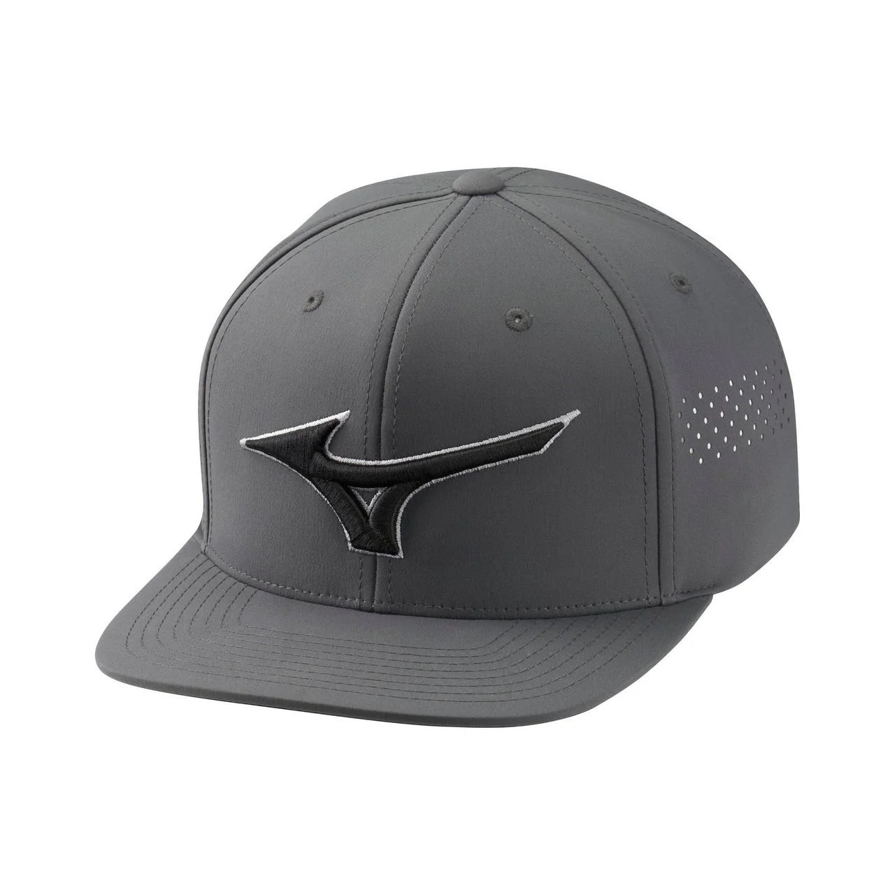 The Mizuno Tour Flat Snapback is a flatbill that shares the same fabric as the Tour Delta style with an adjustable snapback closure. Laser cut vent holes on the side panels add breathability and give the hat a modern look. Features a 3D embroidered logo with accent color outline. The new 3-layer multi-function headband features patent-pending stain block technology to prevent sweat stains on the cap's crown. - Adjustable Snapback Closure - Performance Sweatband - Moisture wicking - Flat Bill - Laser cut ventilation - One Size Fits Most