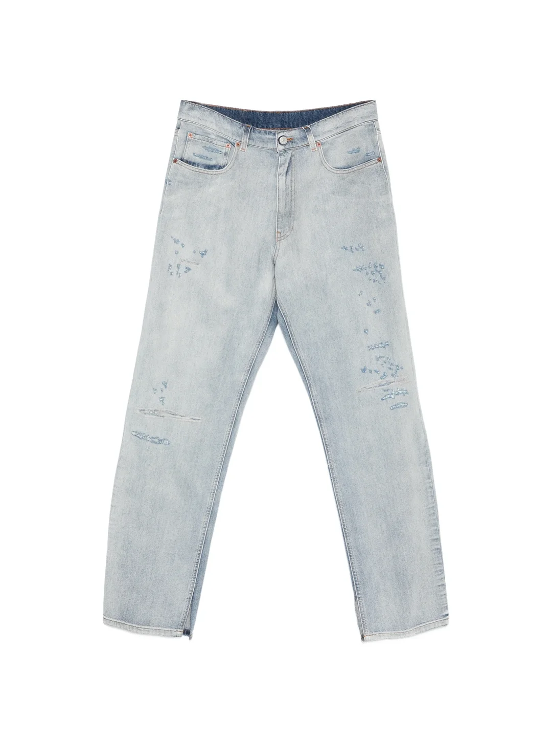 300051772LBL-32 / S6SH0LA0033/M30055/962 - Classic 5-pocket construction - Button fly closure - Distressed detailing throughout - Paint splatter accents - Light blue wash finish - Relaxed straight fit - Cotton denim construction MM6 5 Pocket Pants deliver contemporary streetwear with deconstructed denim craftsmanship and avant-garde design elements. Crafted from premium cotton denim in light blue wash, featuring distressed details and paint-splatter accents throughout. The relaxed fit and signature MM6 aesthetic create a bold statement piece for modern wardrobes.