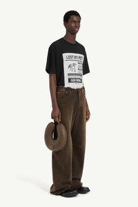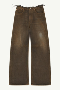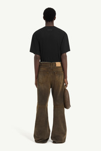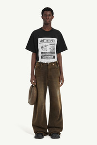 Creatively reinterpreted, these wide-leg denim jeans merge traditional craftsmanship with rebellious modernity. The regular waist features raw-edge detailing, adding a non-conformist edge and a hint of artistic disruption. At the back, the Maison's white stitch line and MM6 numeric signature jacron label subtly underscore the brand's identity. Product Details Item ID SH2LA0015S30848961 Composition: 100% cotton Pocket lining: 65% polyester, 35% cotton Black denim 5 pocket trousers Colour treatment Raw-edge regular waist Zip and button closure Belt loops Wide leg White stitch line and MM6 numeric signature jacron label at the back Made in Italy