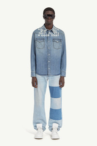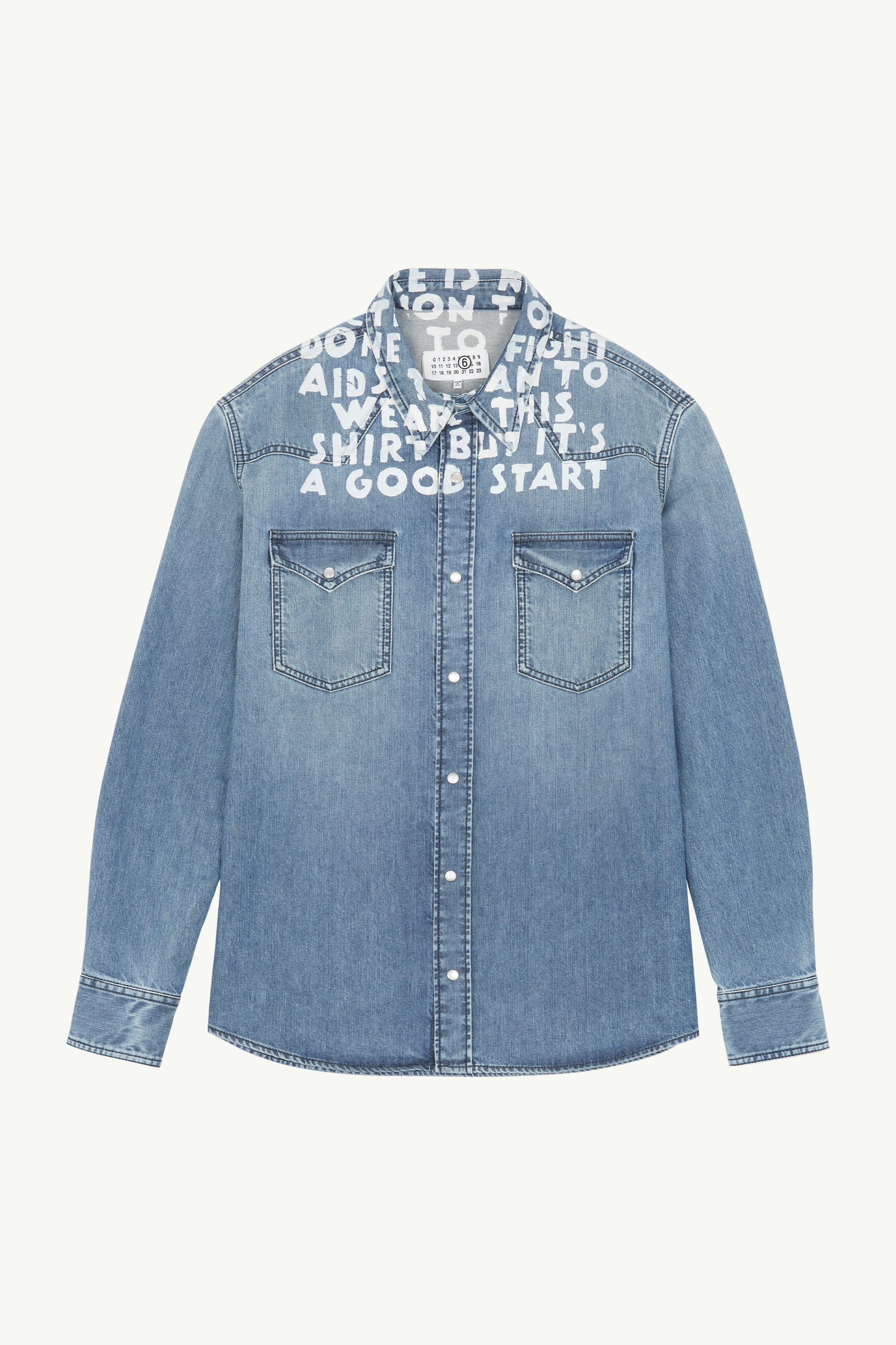 A denim shirt that revisits the iconic SIDA print, originally introduced by the Maison in Autumn/Winter 1993 to spark dialogue and awareness in the fight against HIV and AIDS. Featuring MM6’s white stitch line at the back, it pairs a timeless silhouette with a message of advocacy, with a portion of profits donated to AIDES, a French charity organisation. Product Details Item ID SH2DT0018M30029961 Primary Fabric: 100% Cotton Light blue denim shirt Pointed collar Flap pockets AIDS charity print Buttoned cuffs White stitch line at the back Made in Italy
