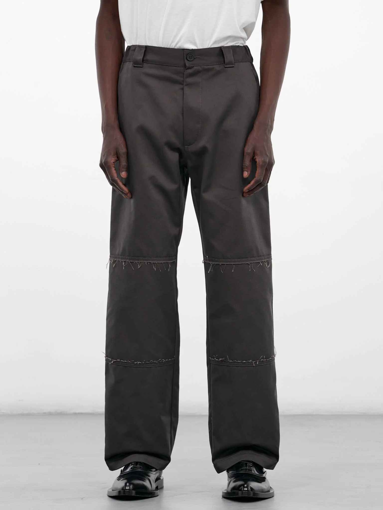 Anthracite poly-cotton twill trousers with frayed seam detailing and white stitch line at back. Featuring: • Wide leg and standard fit • Frayed seam detailing across legs • Belt loops with button and zip front closure • Back patch pockets and white stitch line at back • Made in Italy • Primary Fabric: 65% Polyester 35% Cotton | Pocket Lining: 100% Cotton • Italian sizing Model is 5'11.5" wearing size 48. Shoulders: 16" Chest: 32.5" Waist: 30"