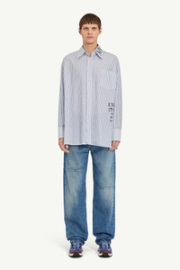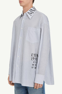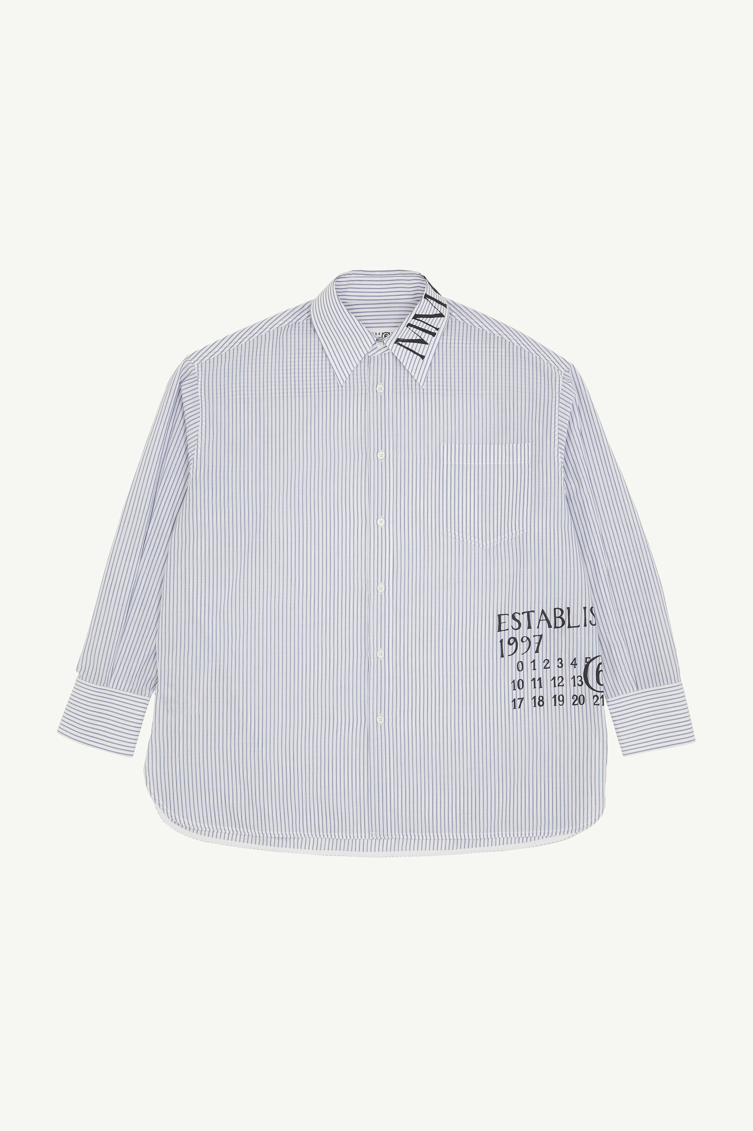 In a tale of classic tailoring with a contemporary twist, this striped poplin shirt embraces abstract visual displacement, featuring MM6's handwritten text print along the side and collar. At the back, the discreet white stitch line subtly reinforces the Maison’s signature deconstructive approach. Product Details Item ID SH0DT0014M35251001F Primary fabric: 100% cotton Striped cotton poplin shirt Handwritten text print at the front Button closure Buttoned cuffs Patch pocket Side slits White stitch line at the back Made in Italy