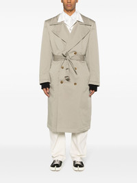 belted double-breasted coat Highlights - Light beige - Cotton blend - Double-breasted button fastening - Belted waist - Two front welt pockets - Peak lapels - Long sleeves - Long length - Straight hem Made in Italy Composition Outer: Cotton 97%, Spandex/Elastane 3% Lining: Polyester 100%, Viscose 100% SIZE & FIT Model measurements Height 6 ft 2 in(1.89 m) Bust/Chest 35.03 in(89 cm) Hips 38.18 in(97 cm) Waist 29.92 in(76 cm)
