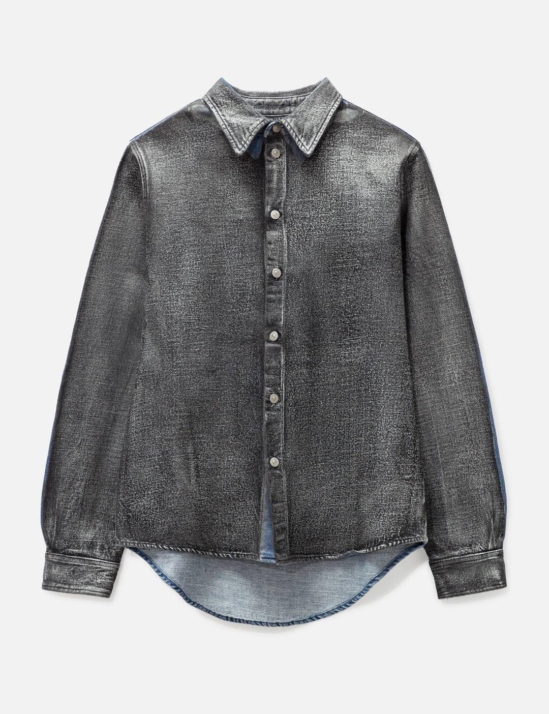 - MM6 Maison Margiela - Bi-Color Denim Shirt - Cotton denim fabric with a paint-like treatment at front - Button closure - Curved hem - Signature single stitch branding at rear yoke - Color: Dark Gray/Medium Indigo - Material: 100% Cotton - See more Shirts and Clothing SIZING - Model wears size 48 - Model measures: Height 187cm, Chest 36”/91cm, Waist 29”/74cm, Hip 37”/94cm