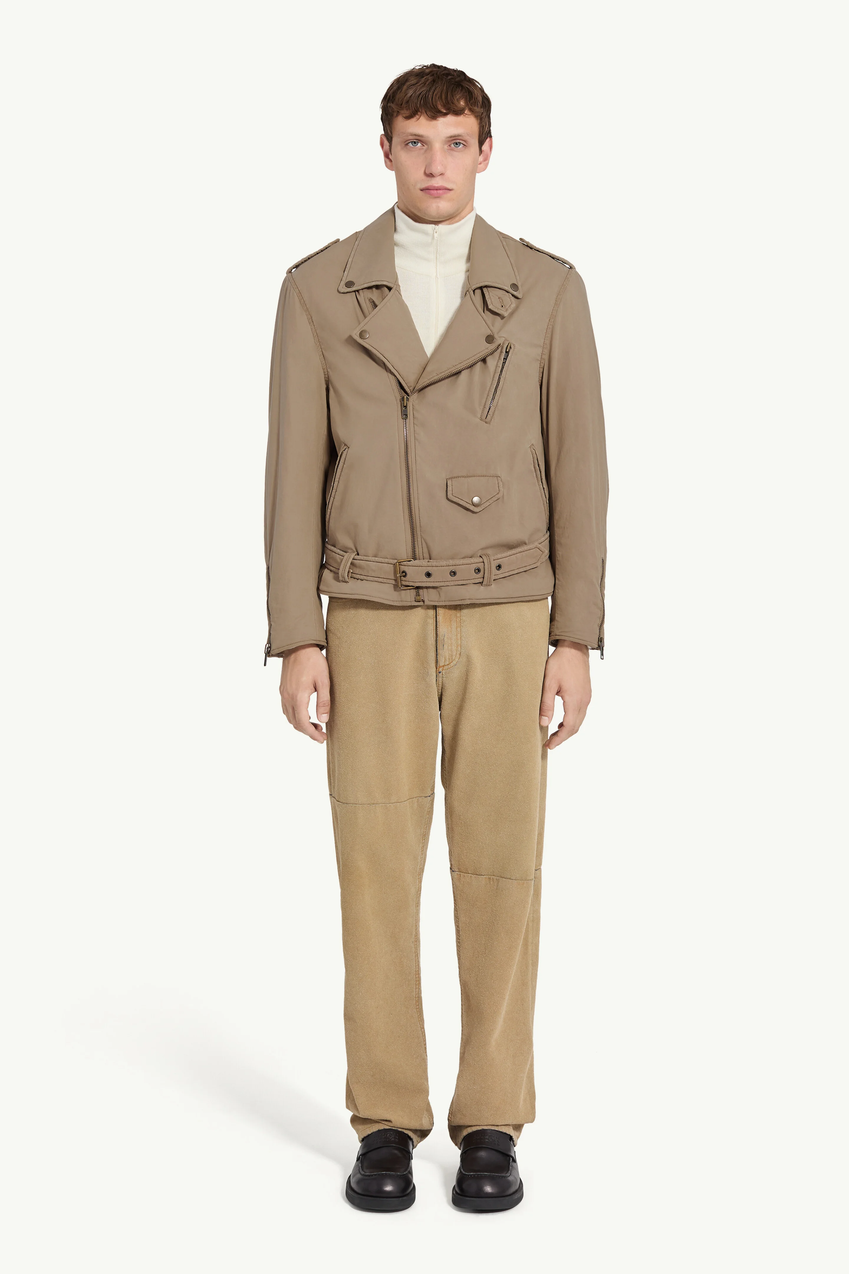 A directional take on the biker jacket, designed in washed cotton for a softened, utilitarian edge. It features a wide notched lapel, zipped pockets, and epaulettes, balanced by a belted waist and zipped cuffs. The asymmetric front fastening reinforces its classic motorcycle reference. At the back, the Maison’s signature white stitch line asserts its discreet identity. Product Details Item ID SH0AM0081M35741115 Primary fabric: 100% cotton Pocket lining: 100% cotton Lining: 100% viscose-rayon Padding: 100% polyester Washed cotton biker jacket with epaulettes Long sleeves Shirt collar Asymmetrical zipper closure at the front White stitch line at the back Made in Italy