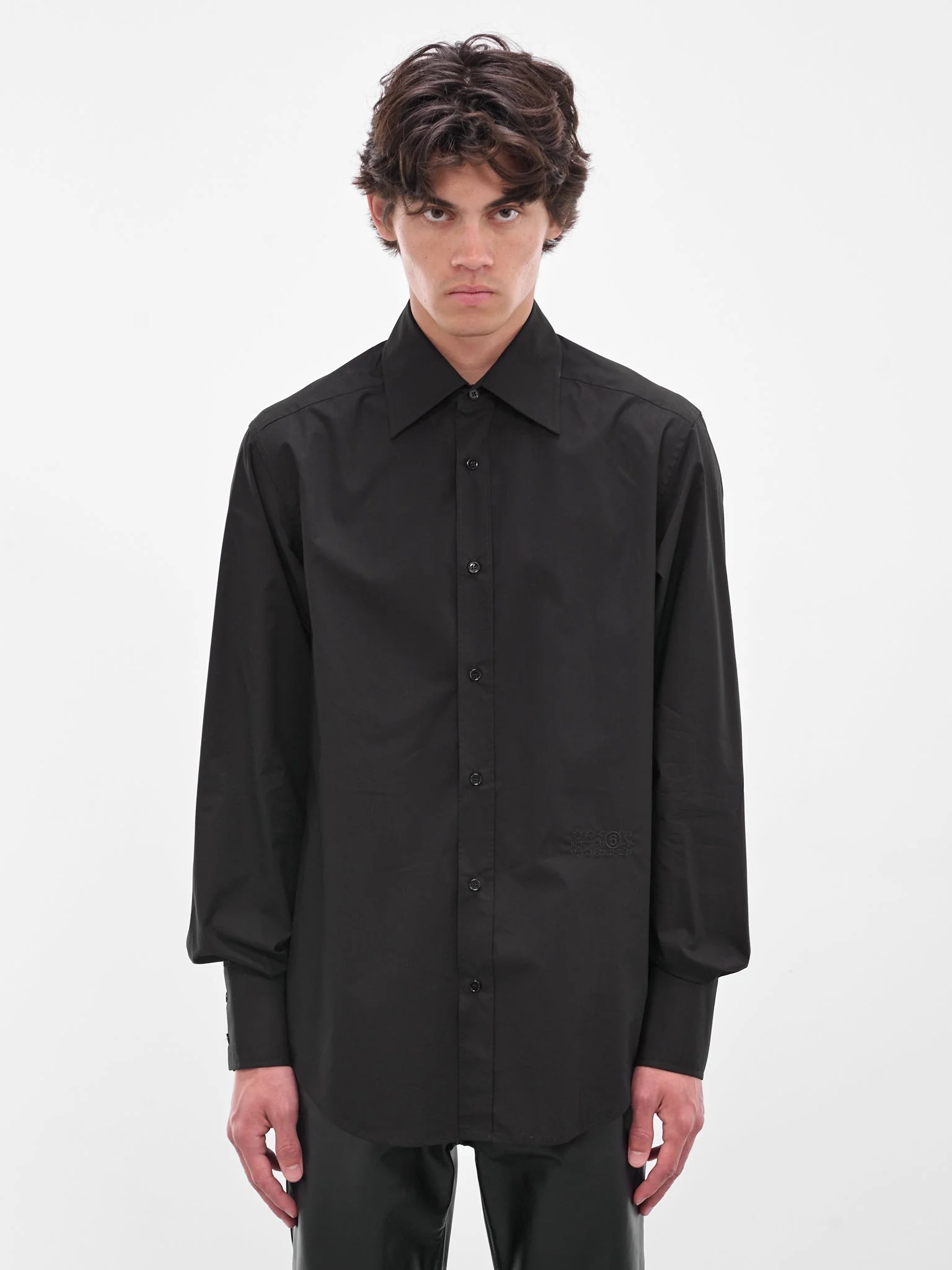 This black shirt elevates a classic dress shirt style with a quiet, signature detail. A small numeric logo embroidered on the side adds a subtle logo embellishment to the timeless design. Featuring: • Relaxed fit • Wide pointed collar • Front button placket closure • Long sleeves with button cuffs • Shirttail hem • Side signature numeric logo embroidery • Italian sizing Model is 6'2" wearing size 48. Shoulders: 19" Chest: 38" Waist: 30"
