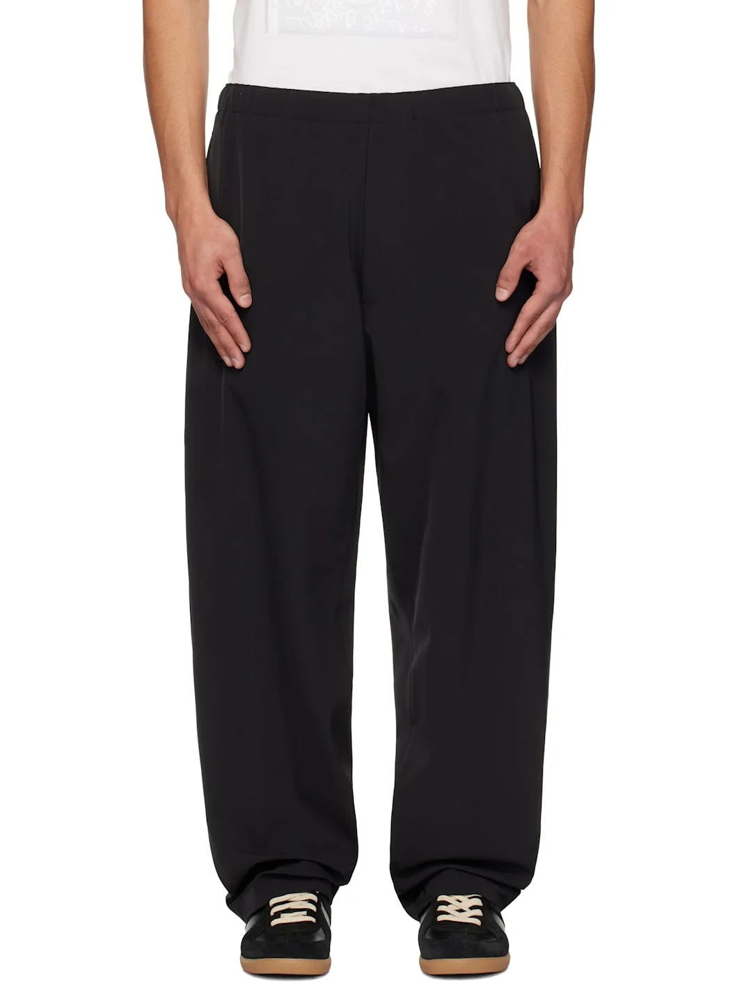 Stretch twill trousers. · Concealed drawstring at elasticized waistband · Three-pocket styling · Zip fly · Logo embroidered at leg · White stitching at back Supplier color: Black Body: 94% polyester, 6% elastane. Trim: 100% viscose. Made in Italy 252188M191005
