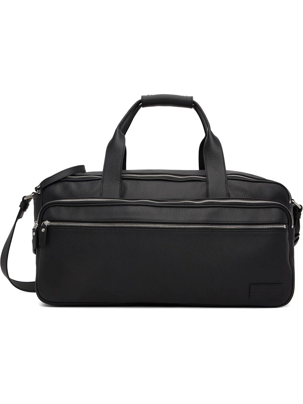 Pebble-grained calfskin duffle bag. · Press-stud tab at rolled carry handles · Adjustable and detachable shoulder strap · Logo patch and zip pockets at face · White stitching at back face · Rolled carry handle at side · Bumper studs at base · Zip closure · Patch pocket at interior · Microfiber lining · Silver-tone hardware · H10.5" x W20" x D8" Supplier color: Black Body: 100% calfskin. Lining: 85% polyester, 10% cotton, 5% polyurethane. Made in Italy 252188M169001