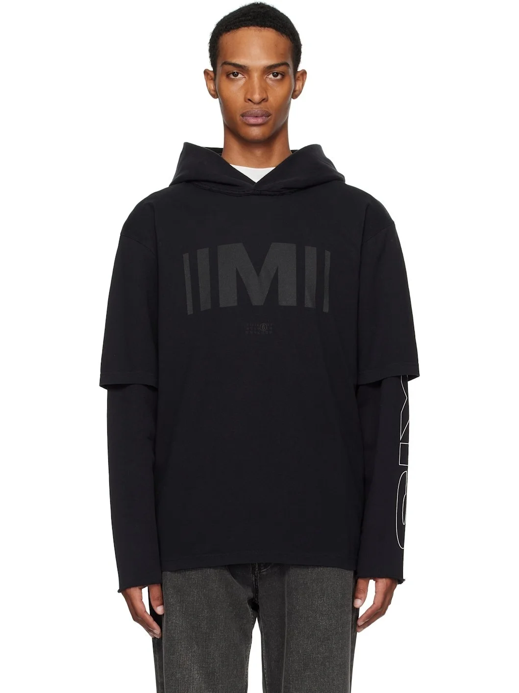 Cotton jersey hoodie. · Raw edges at collar and cuffs · Integrated layered sleeves · Logo printed at front and sleeve · Dropped shoulders · White stitching at back collar Supplier color: Black 100% cotton. Made in Italy 252188M202006